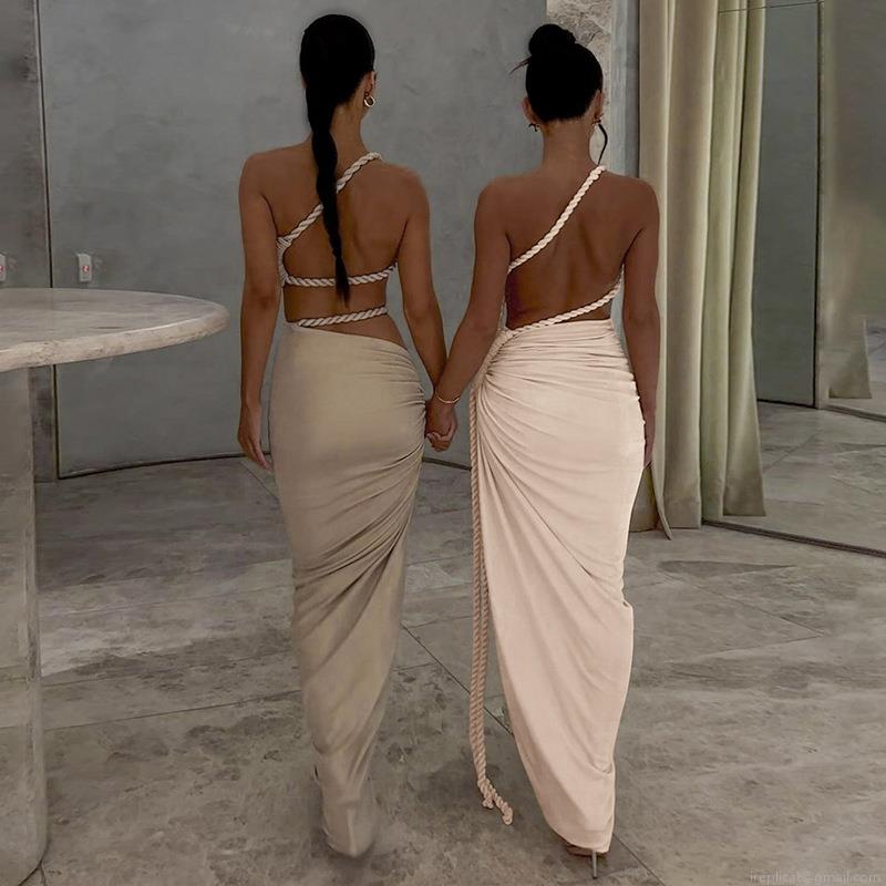 • Women's Sexy One Shoulder Hollow Out Ruched Maxi Dress Backless High Slit Drawstring Bodycon Party Evening Dresses Elegant Long Sundress
