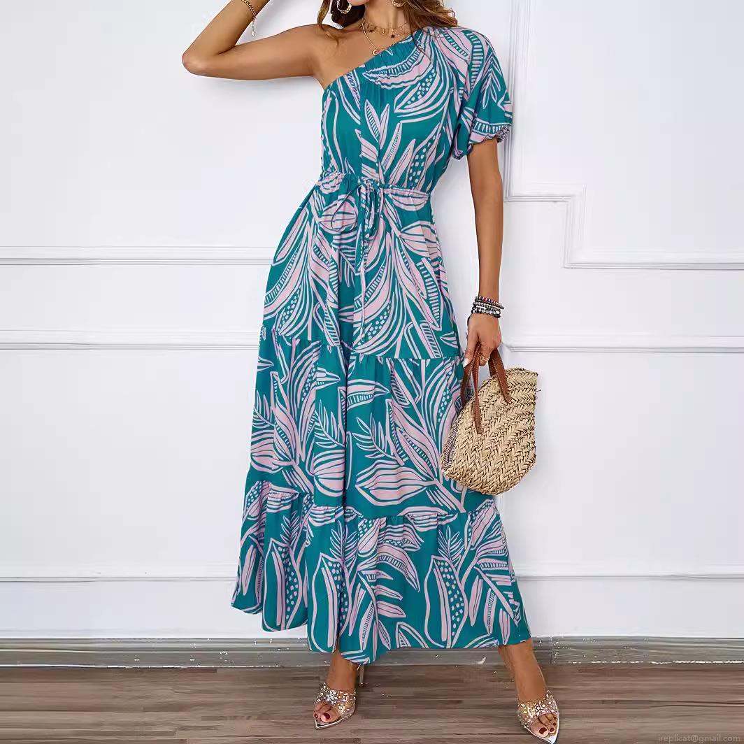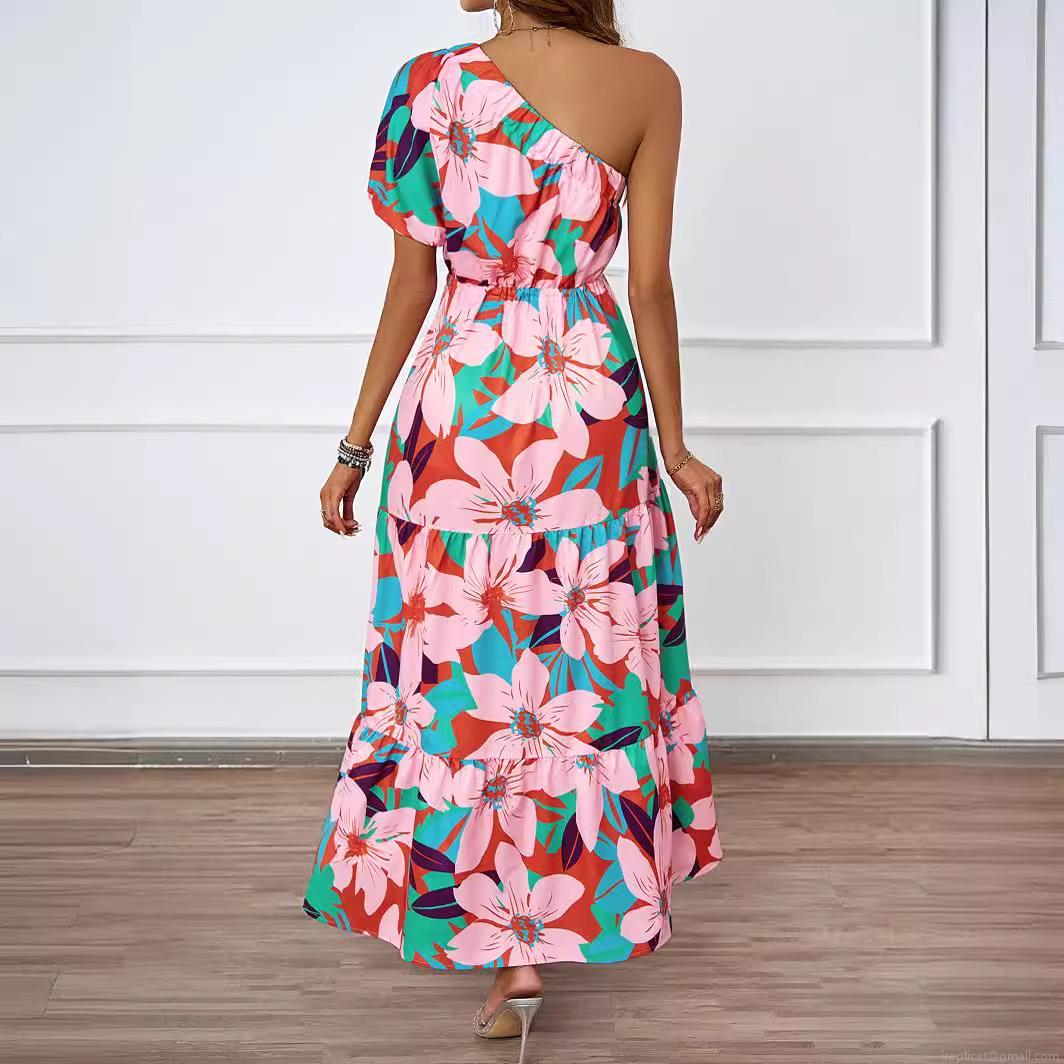 • Women's Sexy One Shoulder Maxi Dress Bohemian Floral Print High Waist Tiered A-Line Long Dress For Summer Beach Vacation Party Casual Polyester Dresses