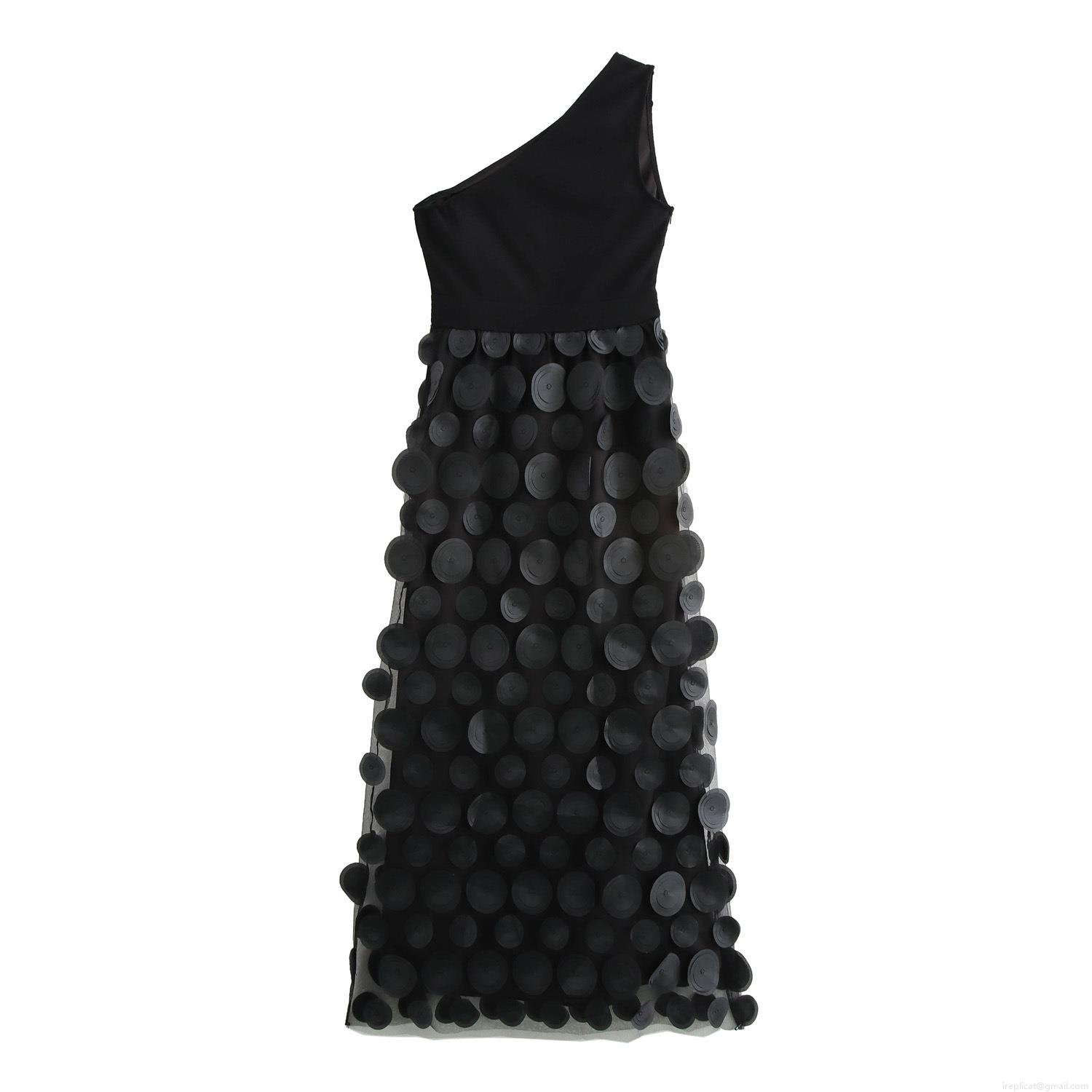• Women's Sexy One Shoulder Maxi Dress Elegant 3D Flower Mesh Applique Evening Party Long Dress Solid Black Sleeveless Banquet Gown
