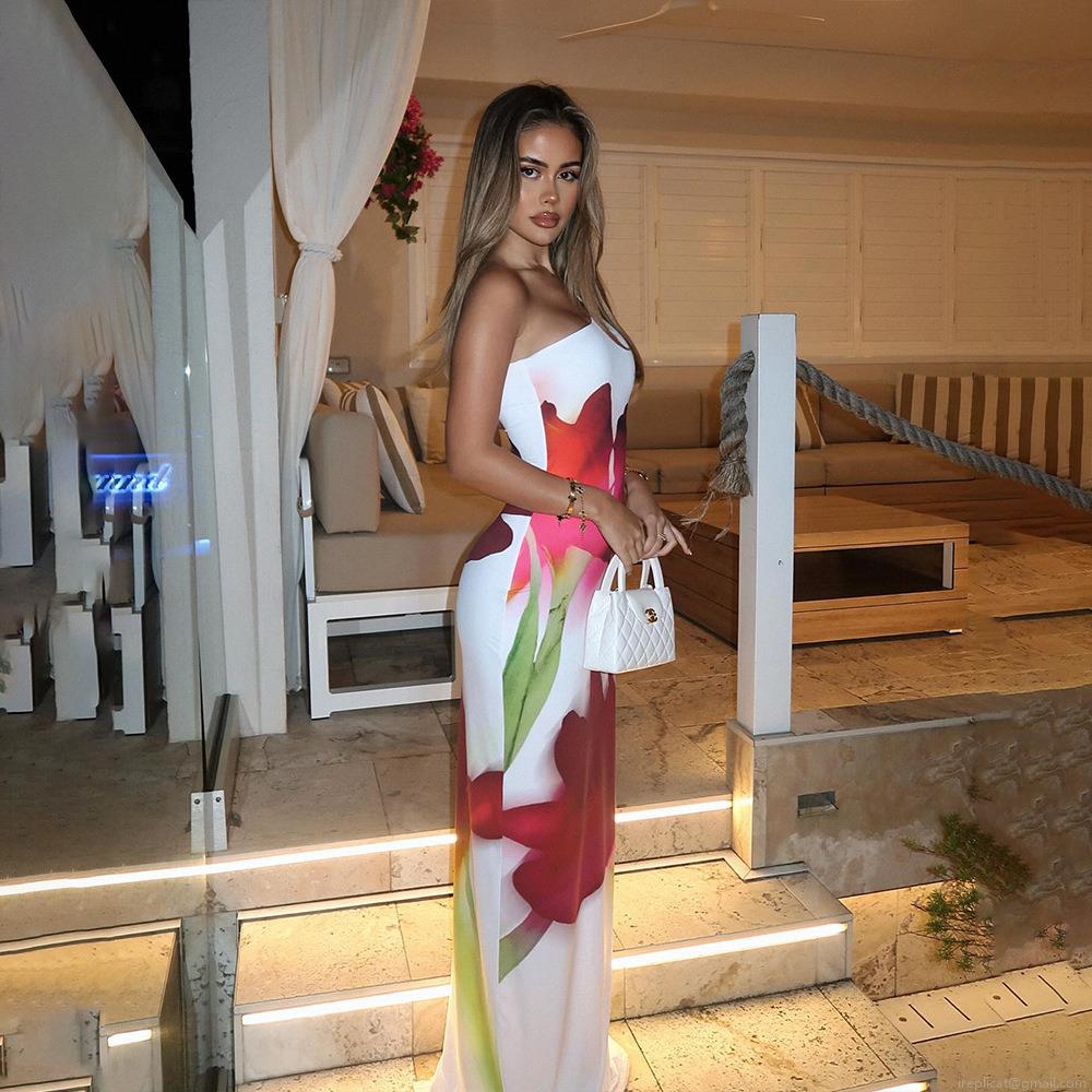 Women's Sexy One Shoulder Maxi Dress Polyester Milk Silk Large Floral Print Slim Fit Sleeveless Bodycon Long Dress For Summer Beach Party Vacation