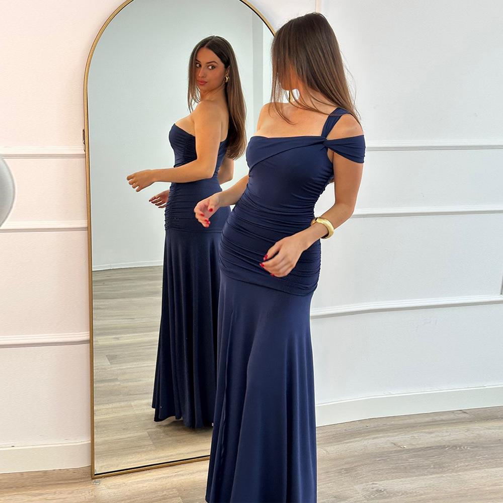 • Women's Sexy One Shoulder Maxi Dress Polyester Ruched High Split Bodycon Evening Gown For Party Wedding Formal Occasion Elegant Slim Fit Lady Clothing