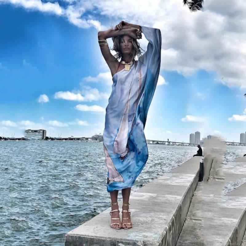 Women's Sexy One Shoulder Maxi Dress Printed Satin Loose Swing Long Beach Holiday Party Dress Butterfly Floral Printed Elegance Gown