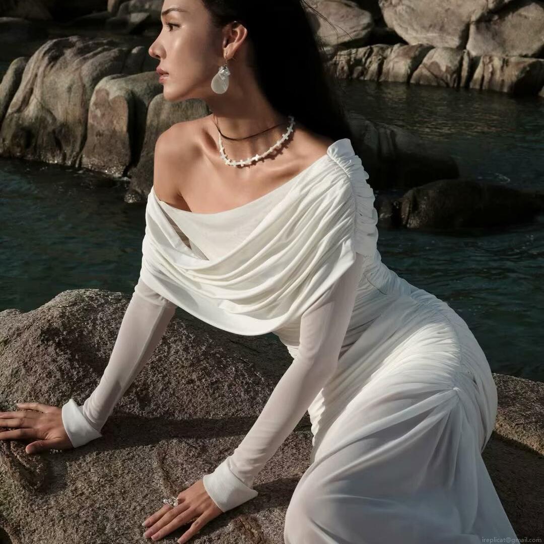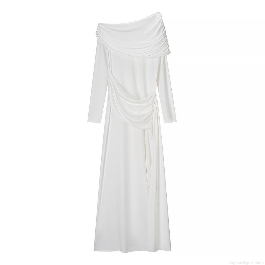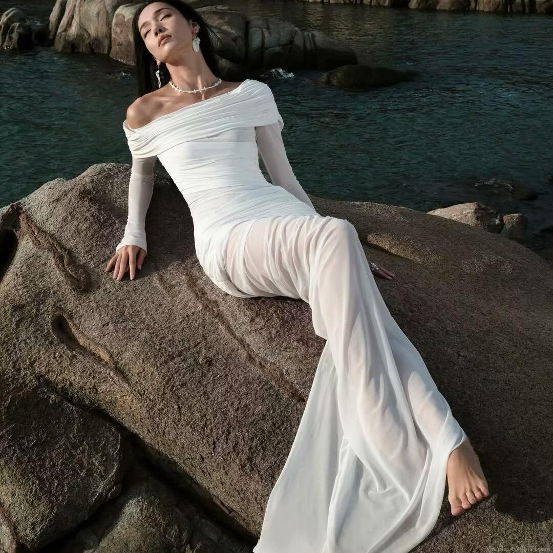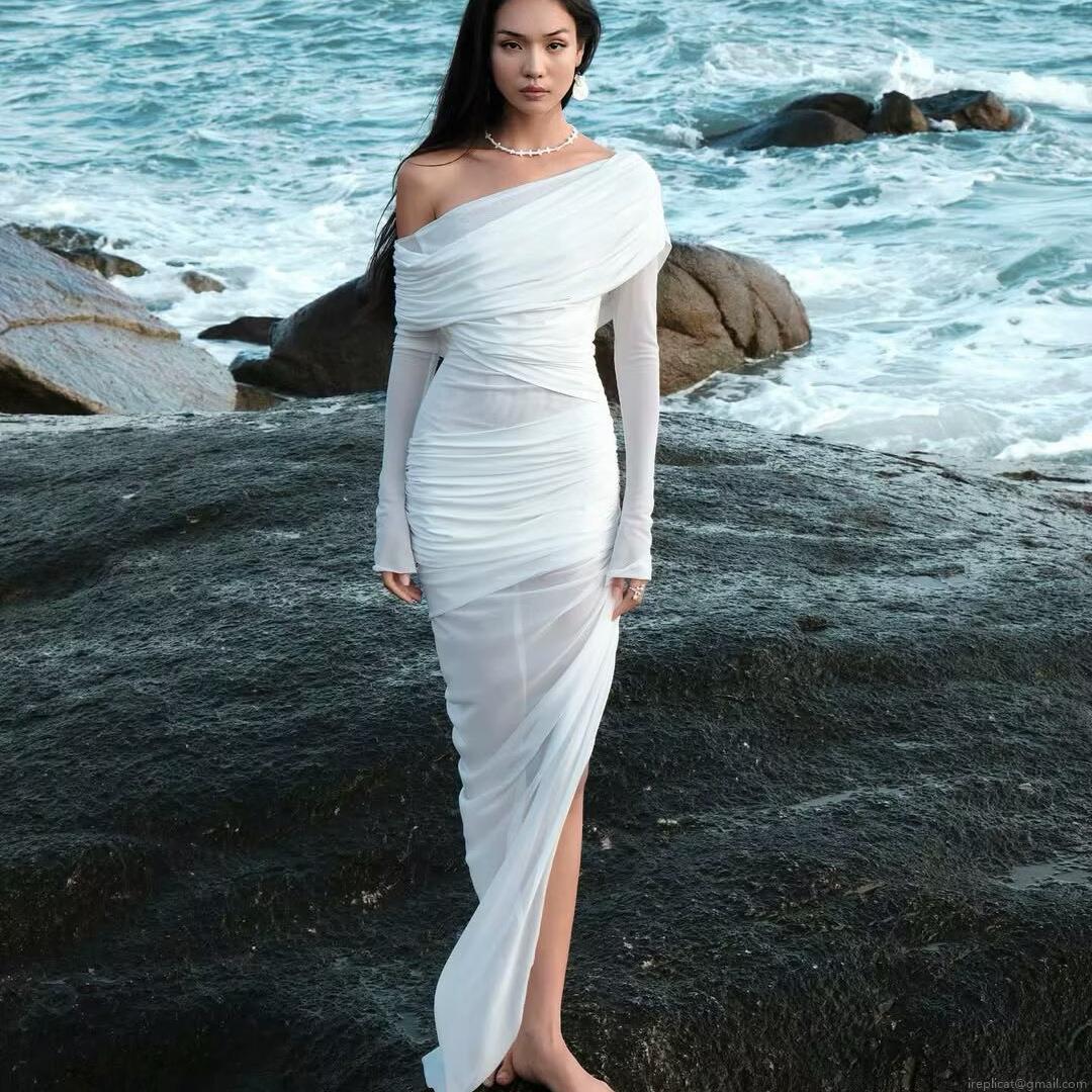 • Women's Sexy One Shoulder Mesh Ruched Maxi Dress Elegant Off Shoulder Long Sleeve High Slit White Evening Party Club Long Dress