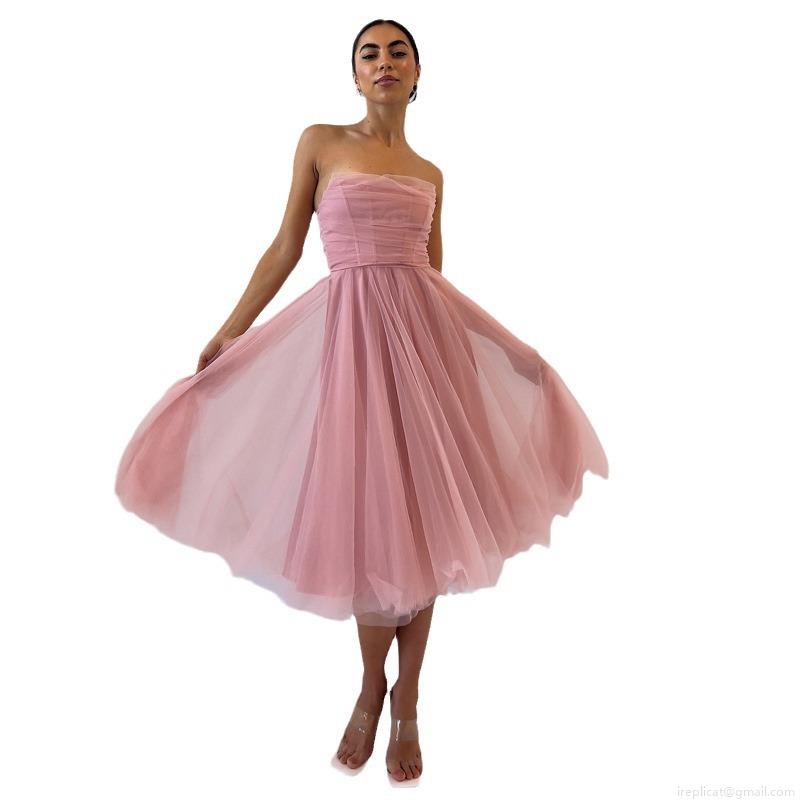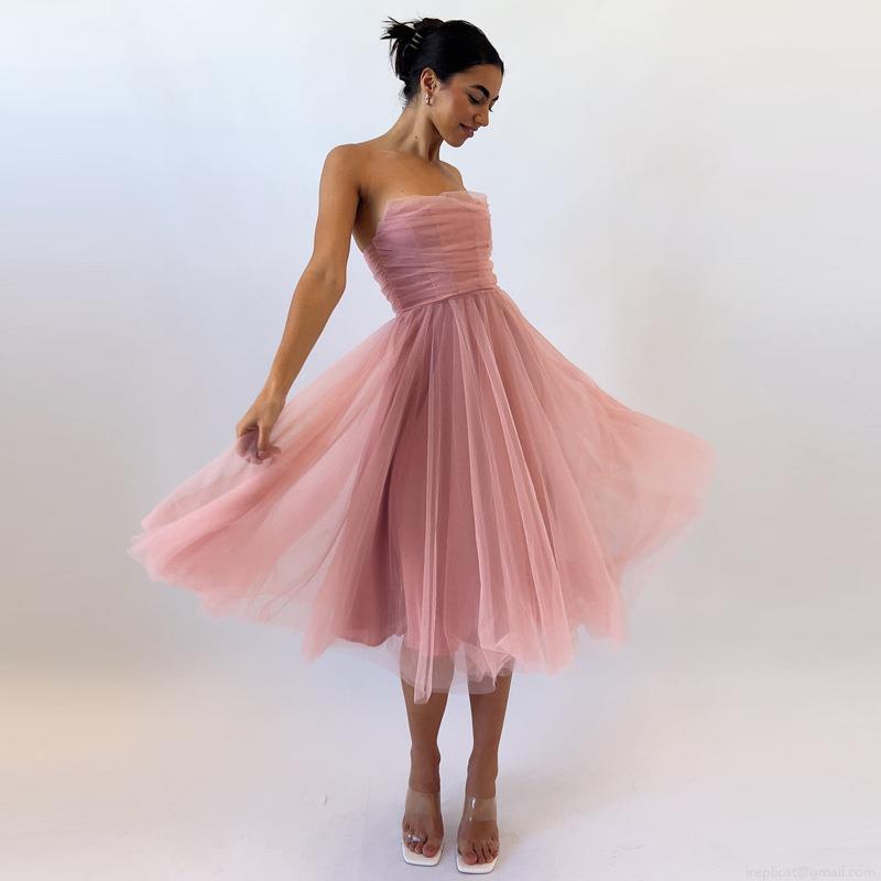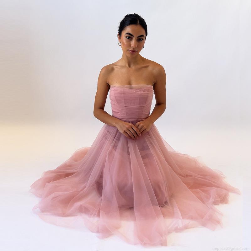Women's Sexy Pink Strapless Mesh Corset Dress Elegant A-Line Maxi Evening Gown For Birthday Party Banquet Formal Wear Sleeveless Mesh Tulle Robe