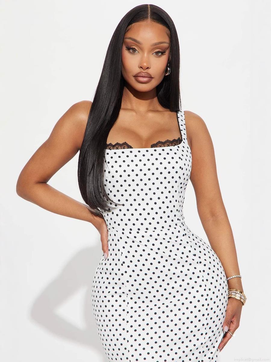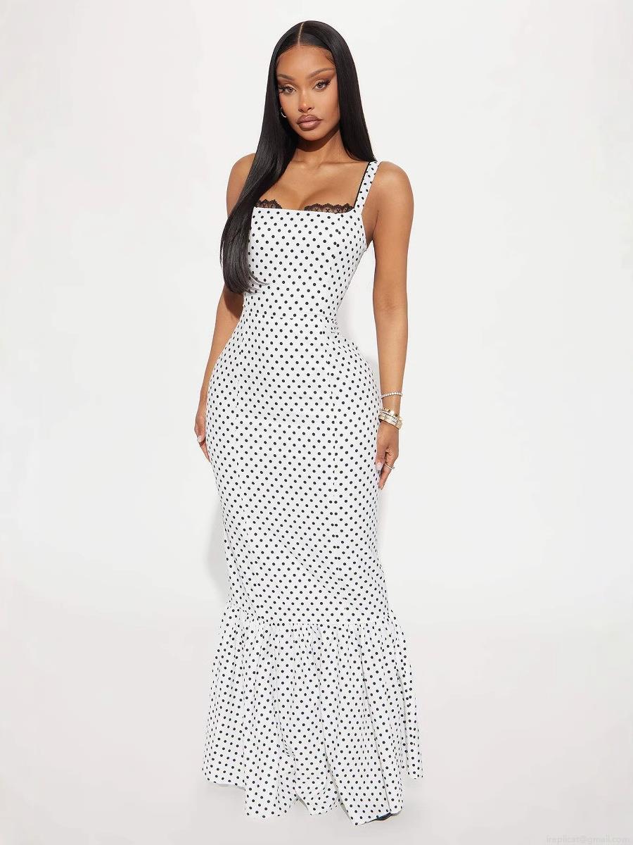 • Women's Sexy Polka Dot Spaghetti Strap Dress Slim Fit Fishtail Hem Maxi Skirt With Black Lace Trim Polyester Cotton Blend Sleeveless Backless Long Dresses For Summer Vacation Party Evening Wedding Guest Wear