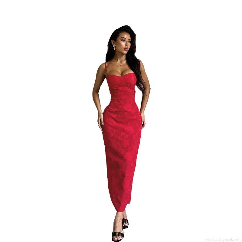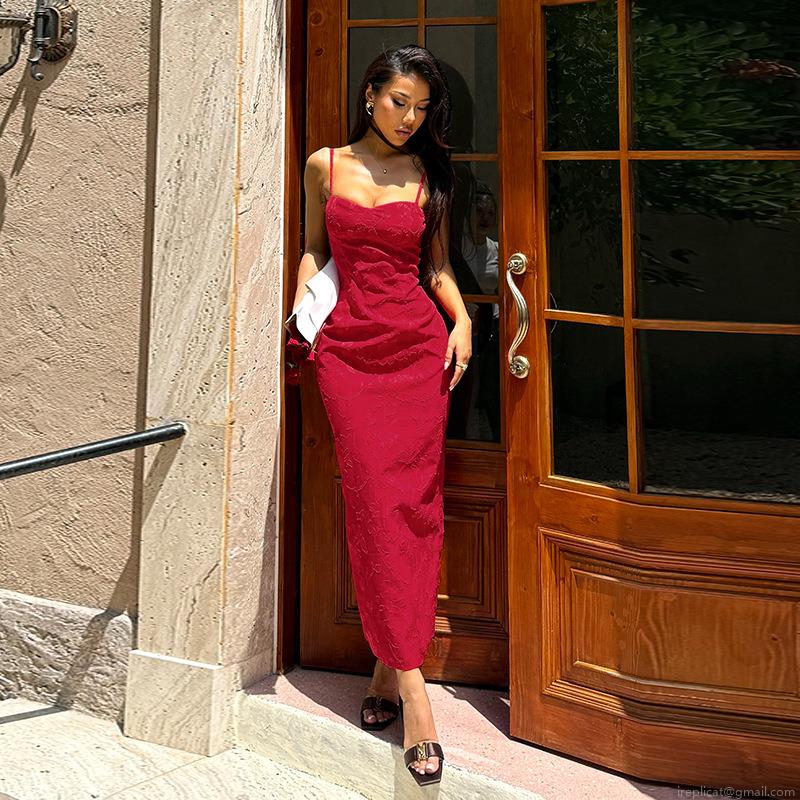 • Women's Sexy Red Rose Jacquard Bodycon Maxi Dress Elegant Backless Strappy Slim Fit Slit Party Evening Long Dress Polyester Spandex