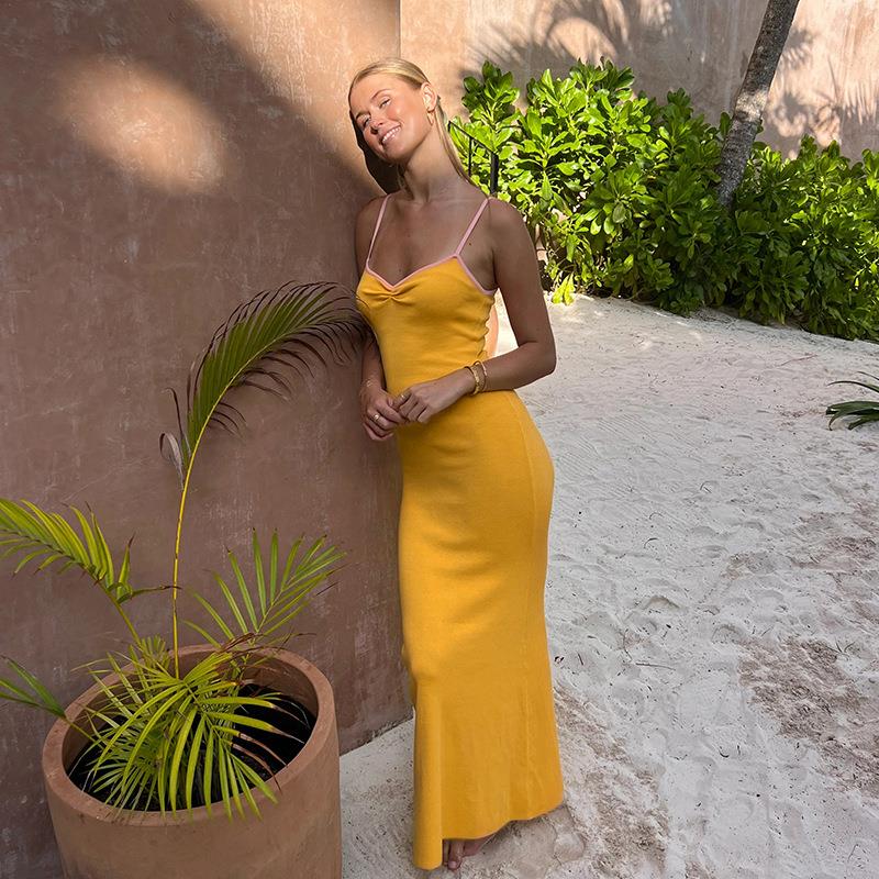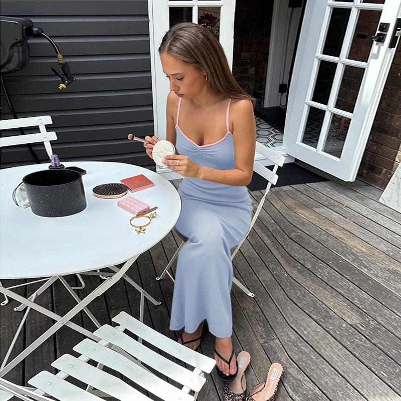 • Women's Sexy Ribbed Knit Cami Maxi Dress V-Neck Contrast Trim Slim Fit Backless Bodycon Long Dress Polyester Spandex Summer Vacation Party Hot Girl Style