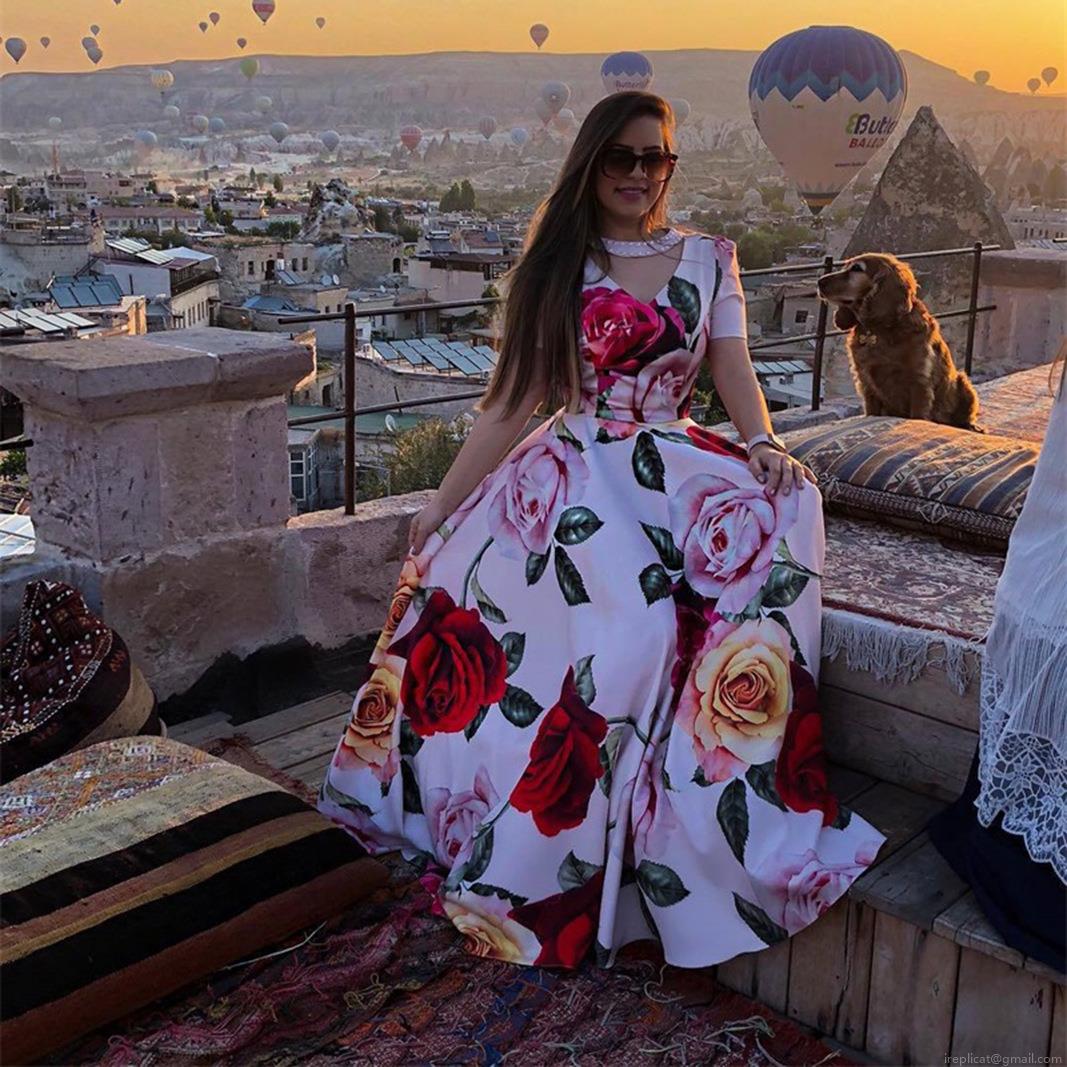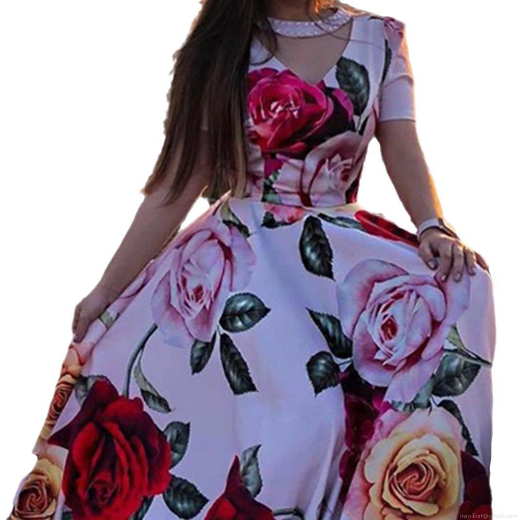 • Women's Sexy Rose Floral Print Maxi Dress V-Neck Beaded Short Sleeve Big Swing Chiffon Long Dress For Summer Vacation Elegant Party Wear