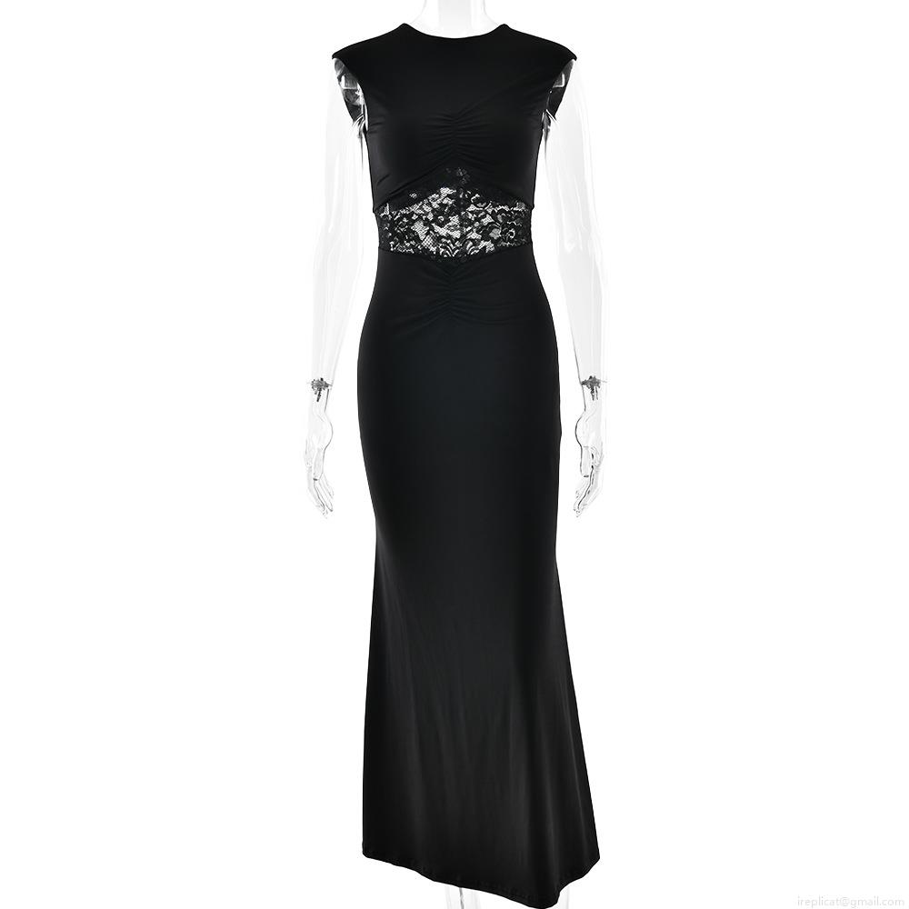 • Women's Sexy Round Neck Sleeveless Lace Patchwork Mermaid Maxi Dress Elegant Ruched Bodycon Party Evening Long Dress Polyester Blend