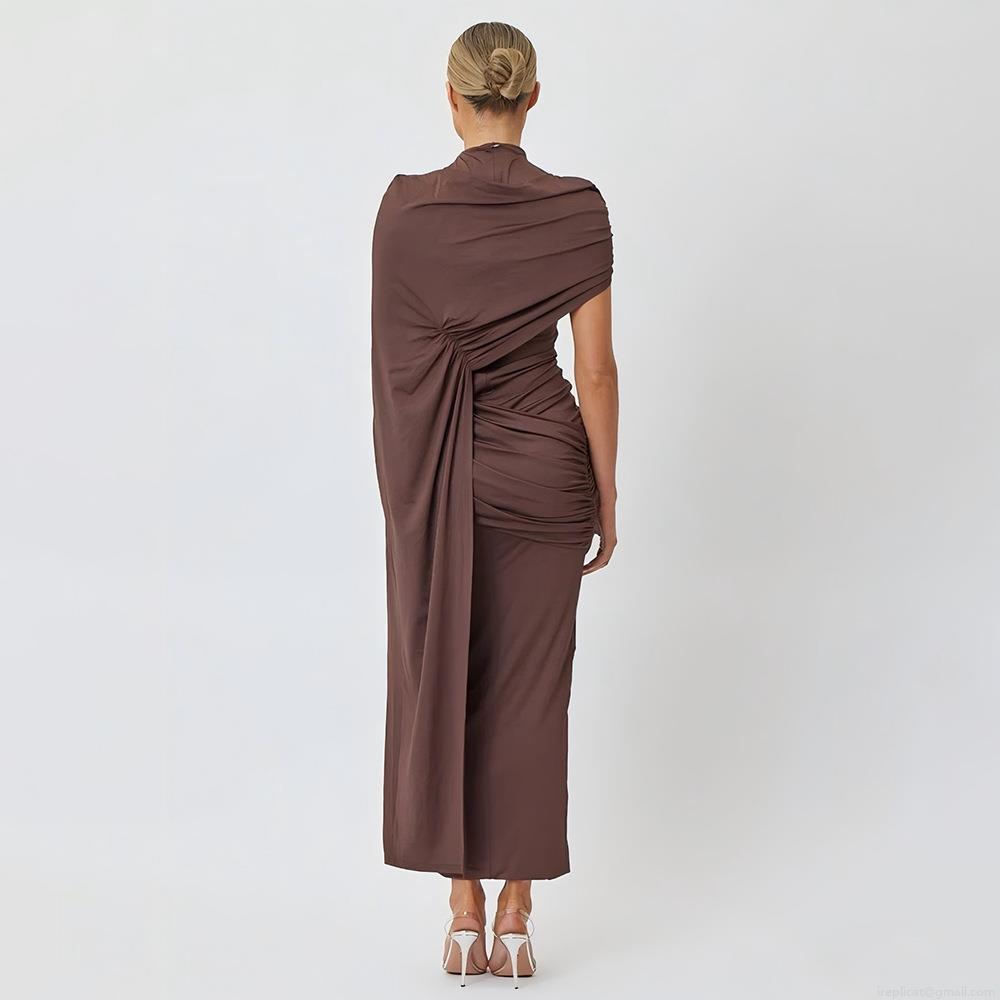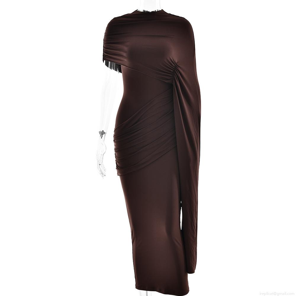 • Women's Sexy Ruched Asymmetric Shoulder Maxi Dress Milk Silk Slim Fit Bodycon Solid Color Long Dress with Cape Sleeve for Party Evening