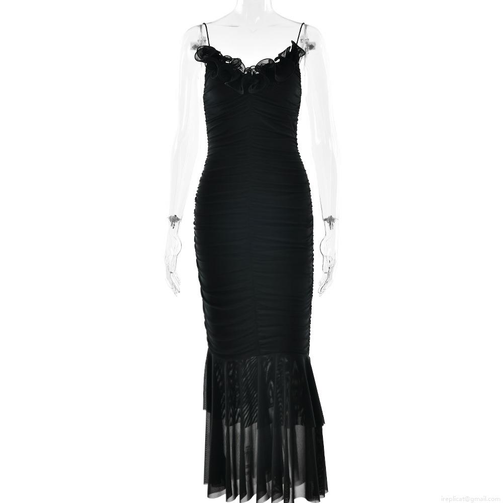 Women's Sexy Ruched Mesh Fishtail Maxi Dress Sleeveless V Neck Backless Ruffle Long Gown For Evening Party Club Bodycon Polyester Milk Silk Dress