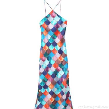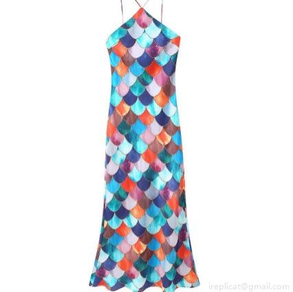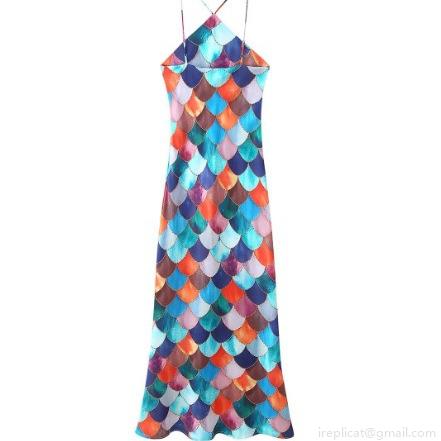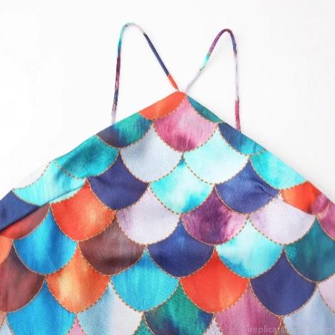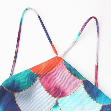 Printing, Satin, Neckband, Fish Scale Pattern, V-neck, Crossback