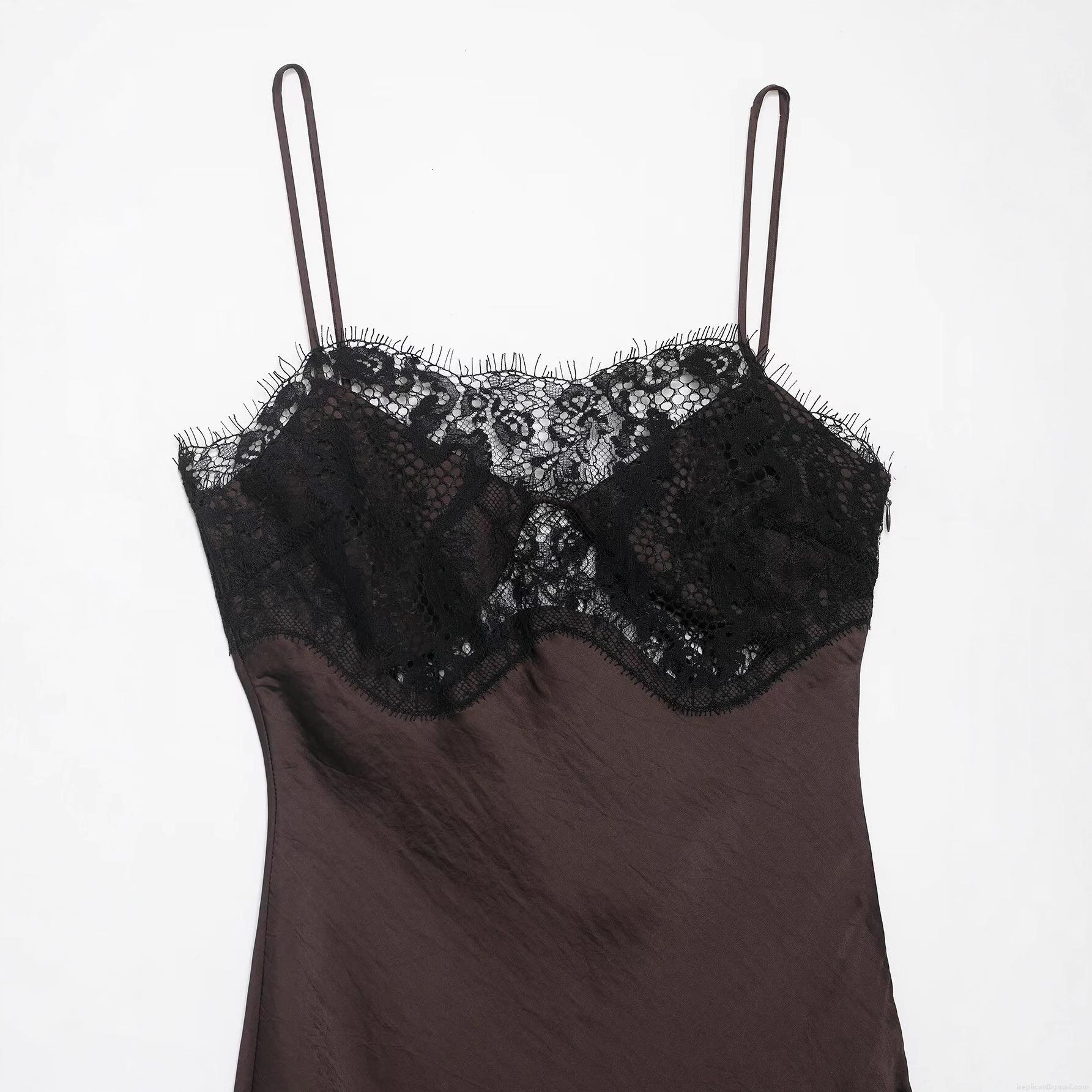Women's Sexy Satin Lace Patchwork Maxi Cami Dress Elegant V Neck Irregular Hem Sleeveless Coffee Chocolate Long Slip Dress Party