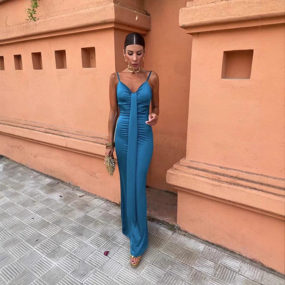 Solid Color, Pleats, Deep V-neck, Thin Straps, Draping Ribbon Design