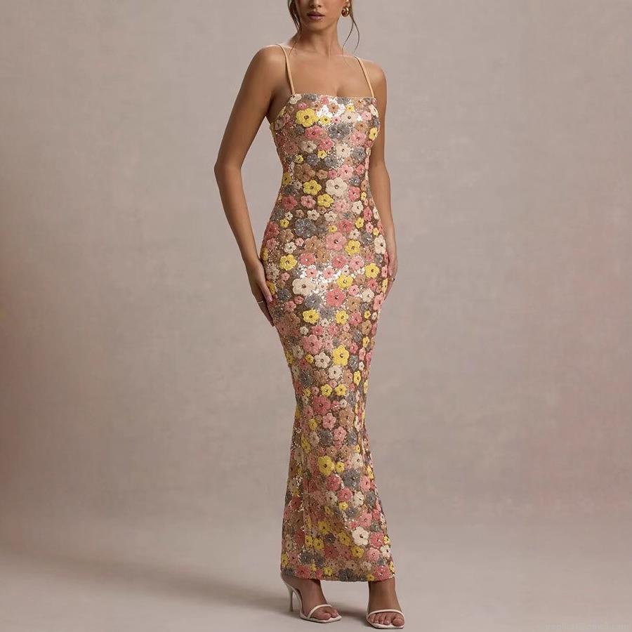 Women's Sexy Sequin Floral Sling Maxi Dress Elegant Slim Fit Party Evening Long Gown Champagne Sleeveless Celebrity Style Dresses