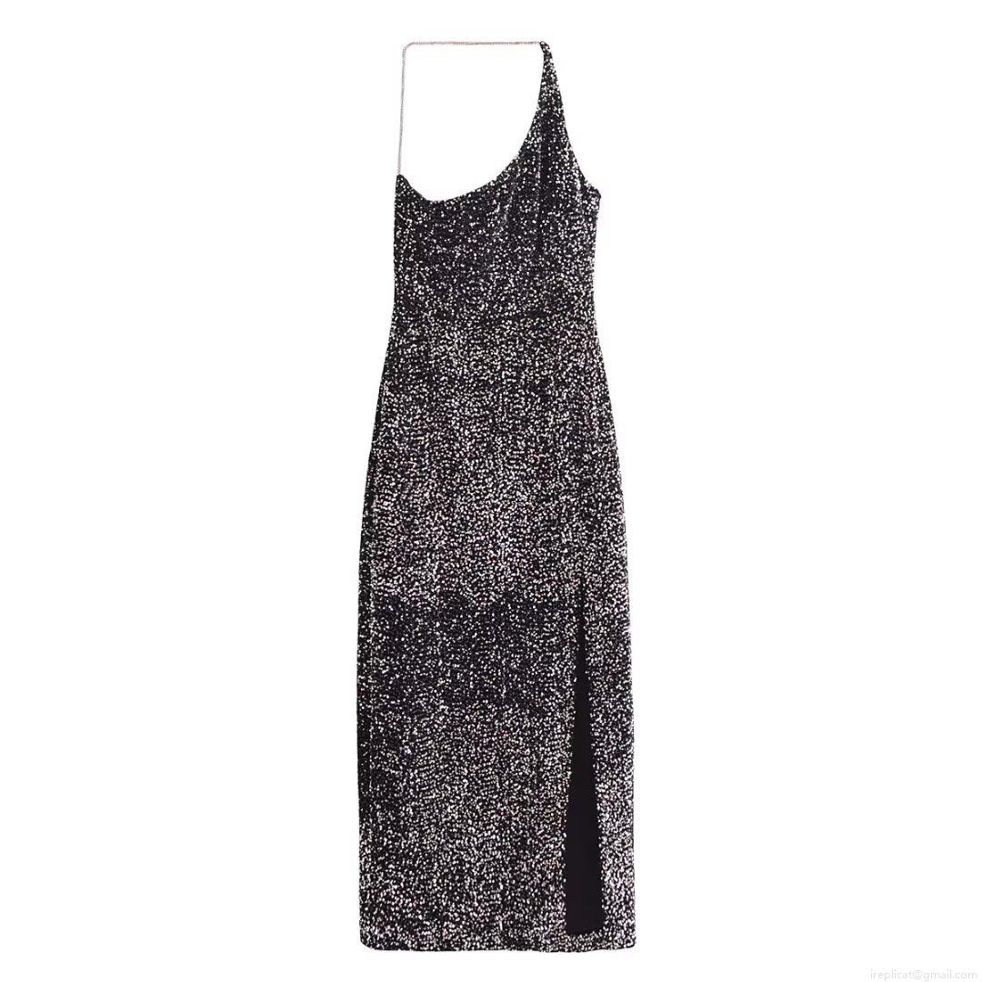 Solid Color, Sequin, Asymmetric, Metal Chain, Neckband, Slit