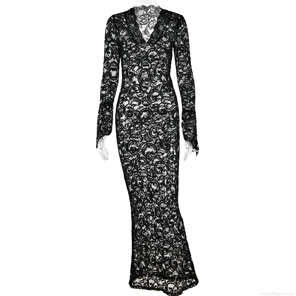 • Women's Sexy Sheer Lace Spliced Maxi Dress Deep V-Neck Flared Long Sleeve See-Through Evening Party Long Dress For Women