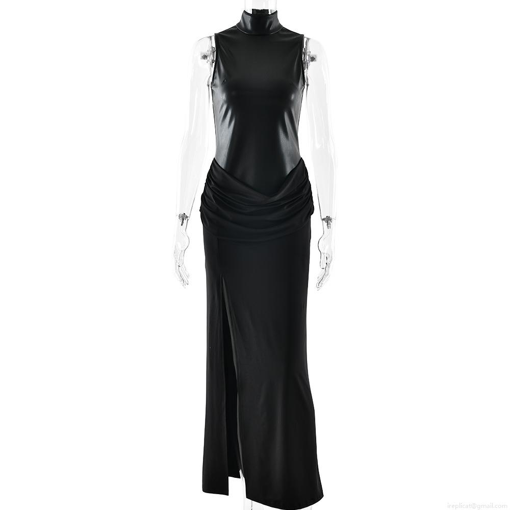 • Women's Sexy Sleeveless High Neck PU Leather Patchwork Maxi Dress Ruched High Slit Bodycon Long Gown For Party Evening Club