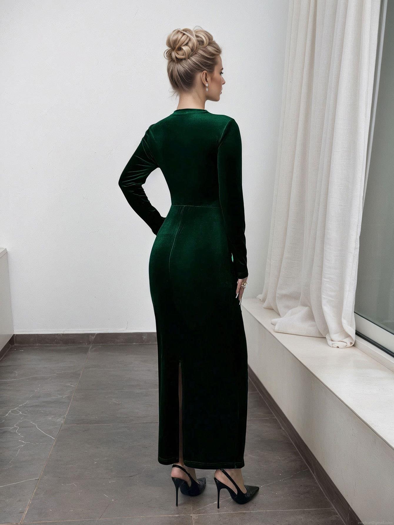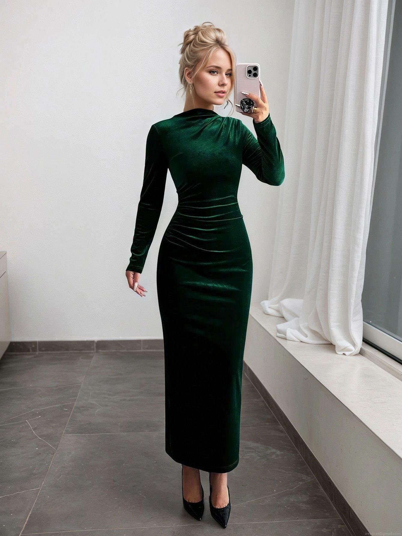 • Women's Sexy Slim Fit Velvet Maxi Dress High Neck Long Sleeve Ruched Bodycon Evening Party Long Dresses For Autumn Winter Ladies Clothing