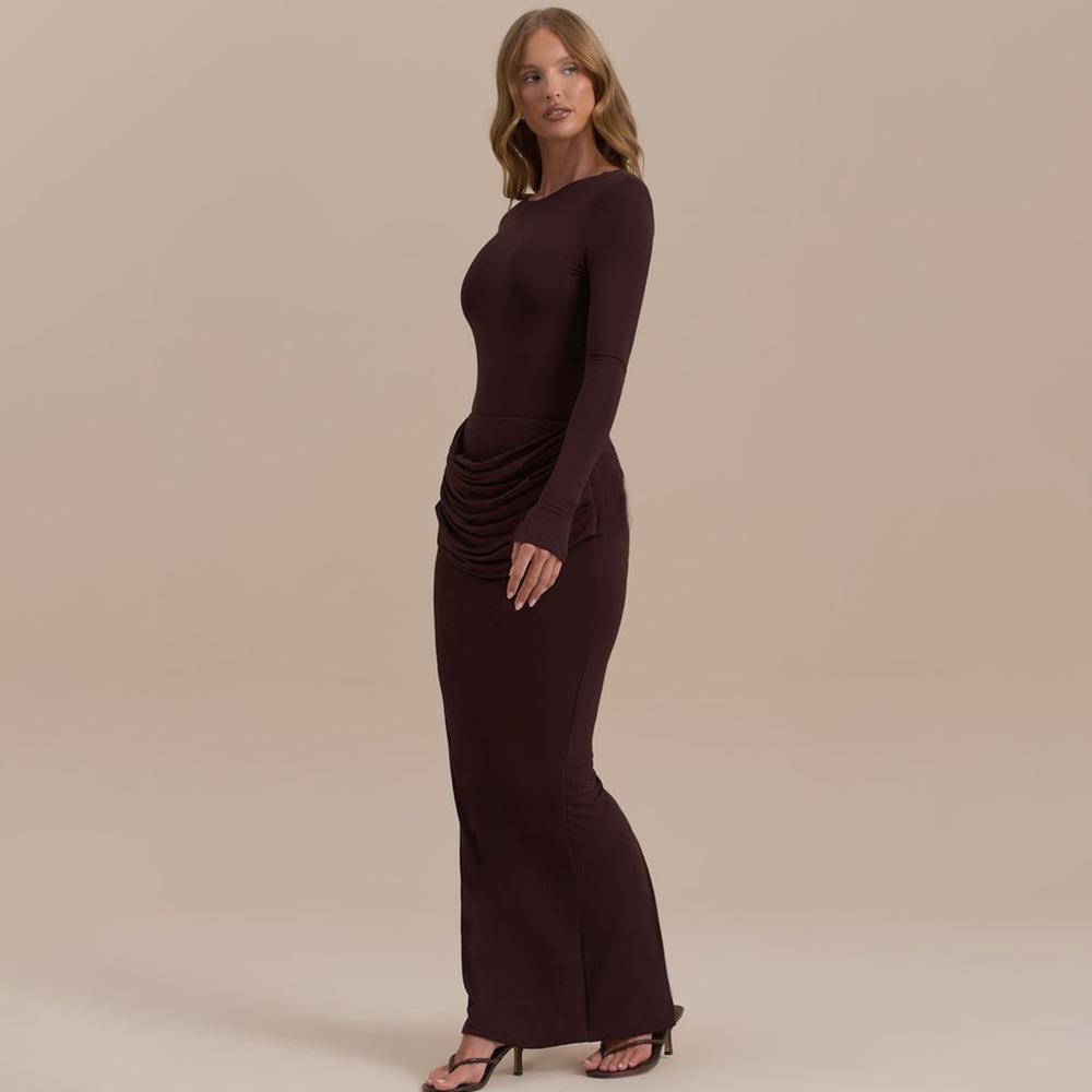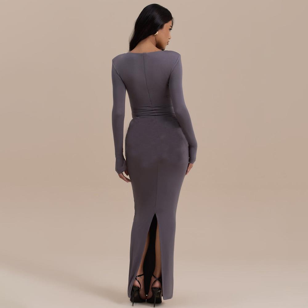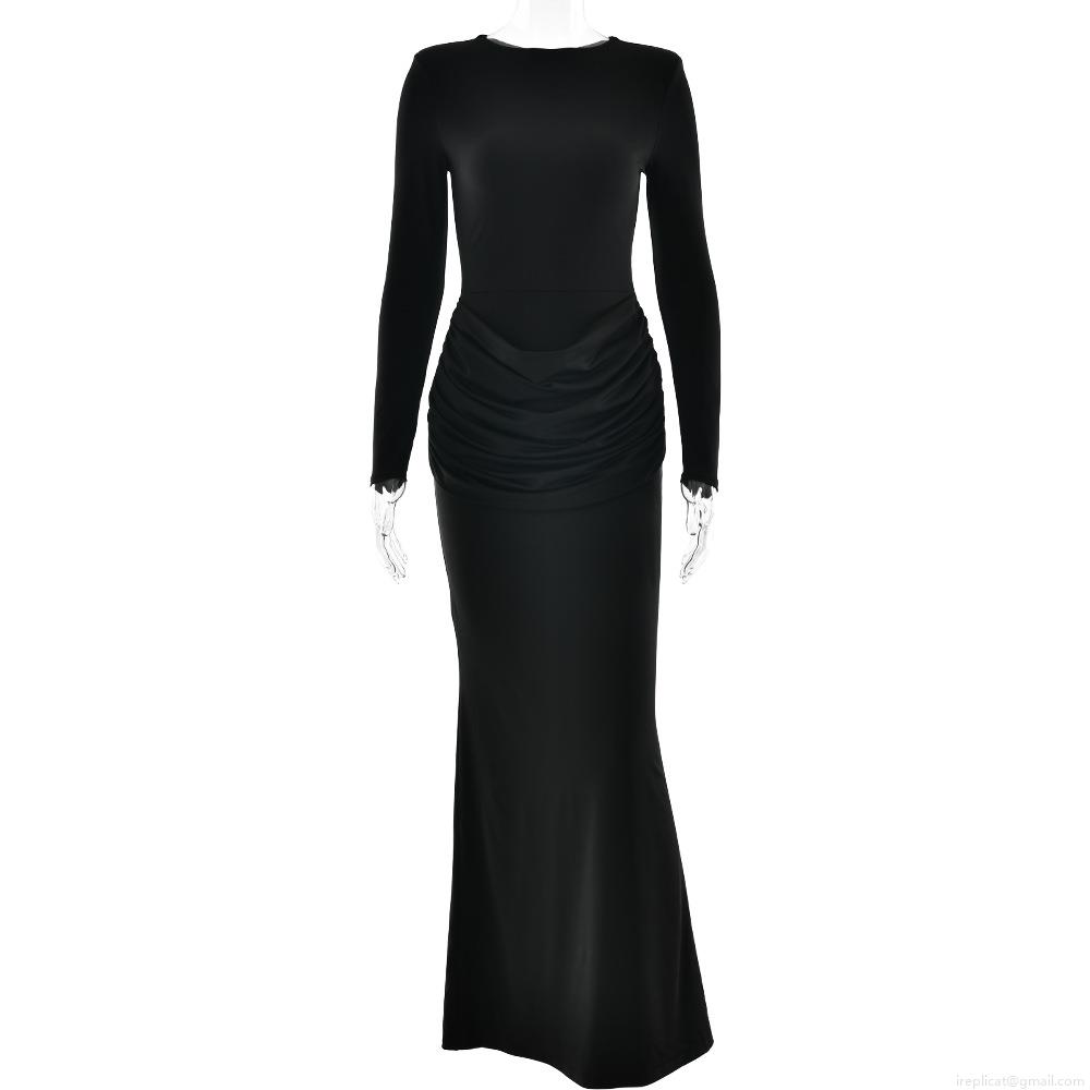 • Women's Sexy Solid Color Round Neck Long Sleeve Ruched Bodycon Maxi Dress With Back Slit Elegant Fishtail Slim Fit Evening Party Long Dress