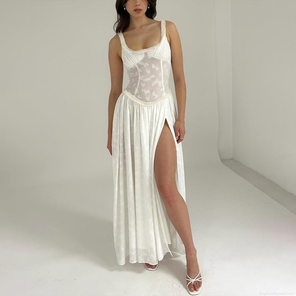 • Women's Sexy Spaghetti Strap Backless Maxi Dress Floral Embroidery Chiffon High Split Bodycon Long Dress Elegant Summer Vacation Party Wear