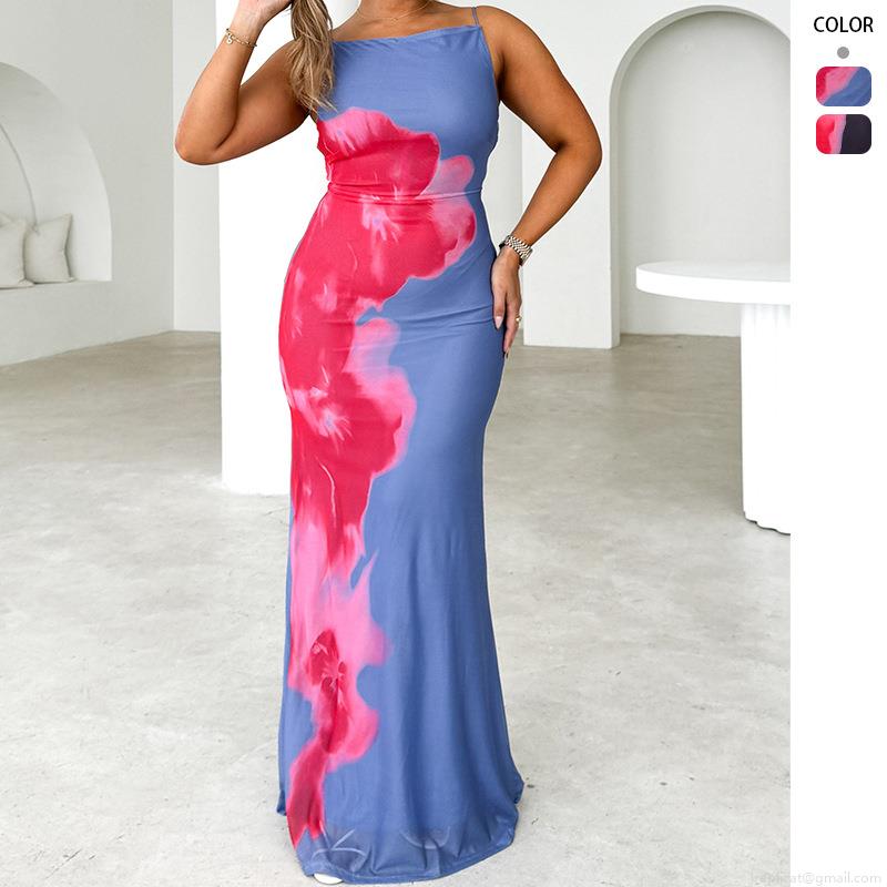 • Women's Sexy Spaghetti Strap Maxi Dress Contrast Floral Print Slim Fit Backless Cutout Long Dress Summer Beach Vacation Streetwear