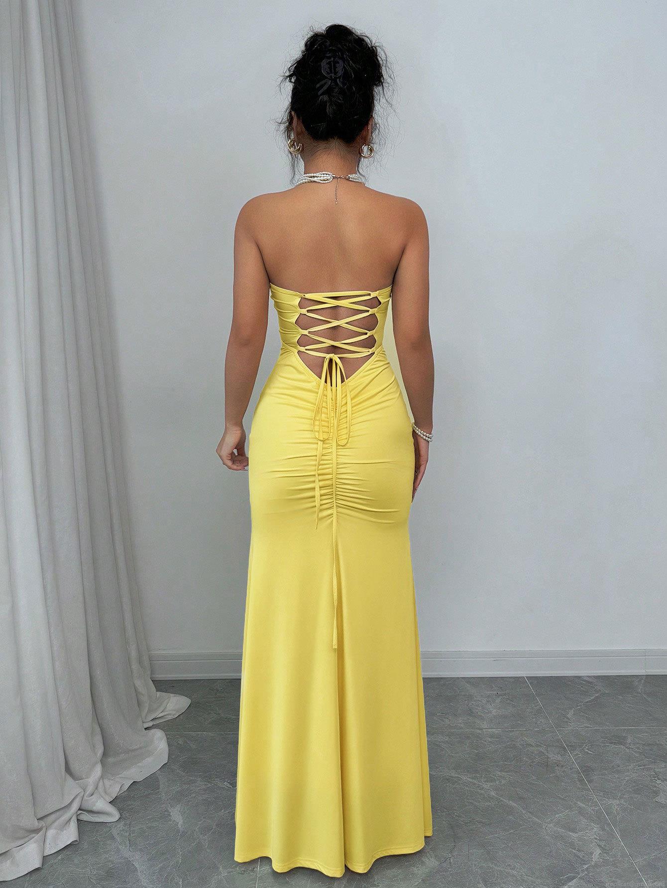 • Women's Sexy Strapless Backless Lace-up Maxi Dress Slim Fit Bodycon Knit Long Dress for Party Evening Clubwear Solid Color Yellow