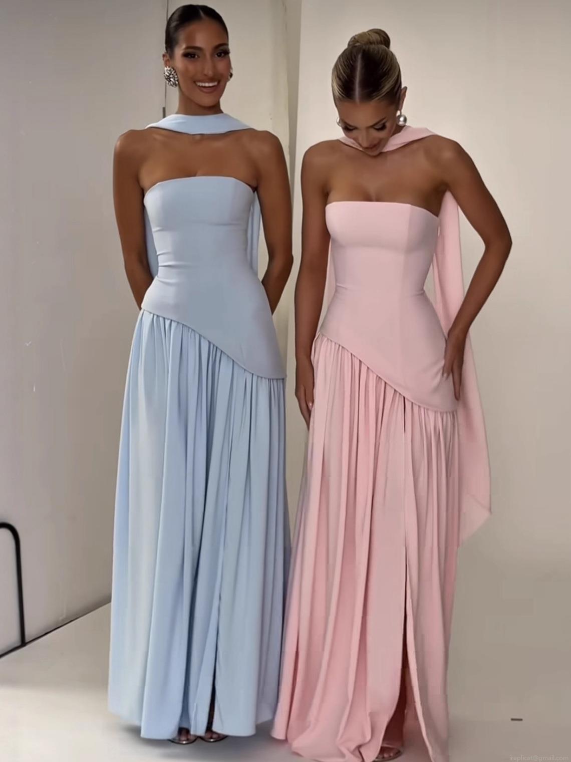 Women's Sexy Strapless Maxi Dress Elegant Color Block High Slit Evening Gown With Matching Neck Scarf Formal Party Banquet Sleeveless Long Dress