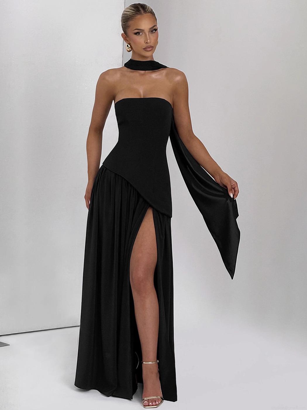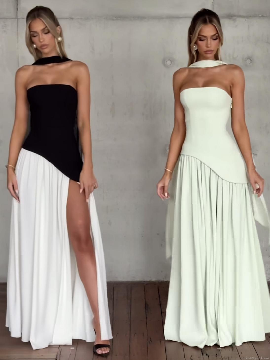 • Women's Sexy Strapless Maxi Dress Elegant Color Block High Slit Evening Gown With Matching Neck Scarf Formal Party Banquet Sleeveless Long Dress