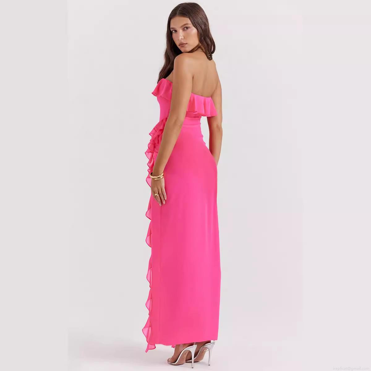• Women's Sexy Strapless Maxi Dress Elegant Polyester Ruffle High Slit Party Evening Long Dress Solid Color Off-Shoulder Slim Fit Bodycon Dress For Summer Beach Vacation