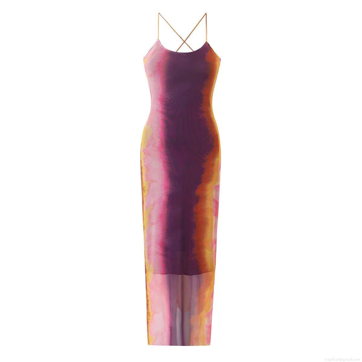 • Women's Sexy Tie Dye Gradient Mesh Camisole Dress Backless Criss Cross Straps Side Slit Slim Fit Long Maxi Dress For Summer Vacation Party Night Club