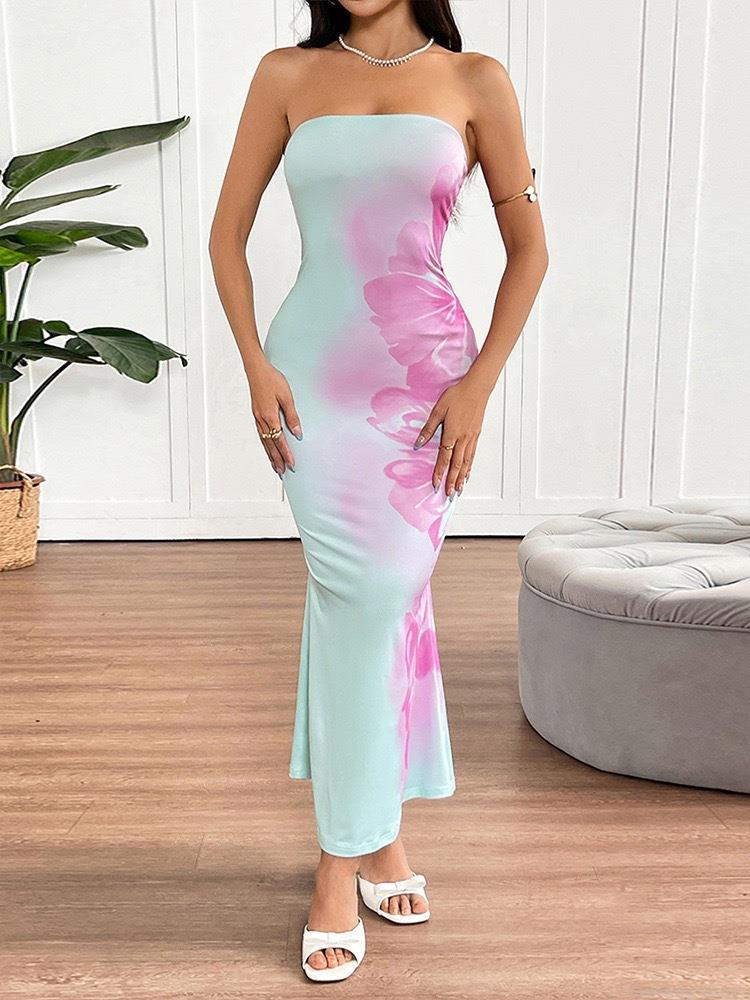 • Women's Sexy Tube Top Maxi Dress Floral Print Backless Bodycon Long Dress Polyester Spandex Slim Fit Sleeveless Evening Party Clubwear Gradient Blue Pink Floral Sundress