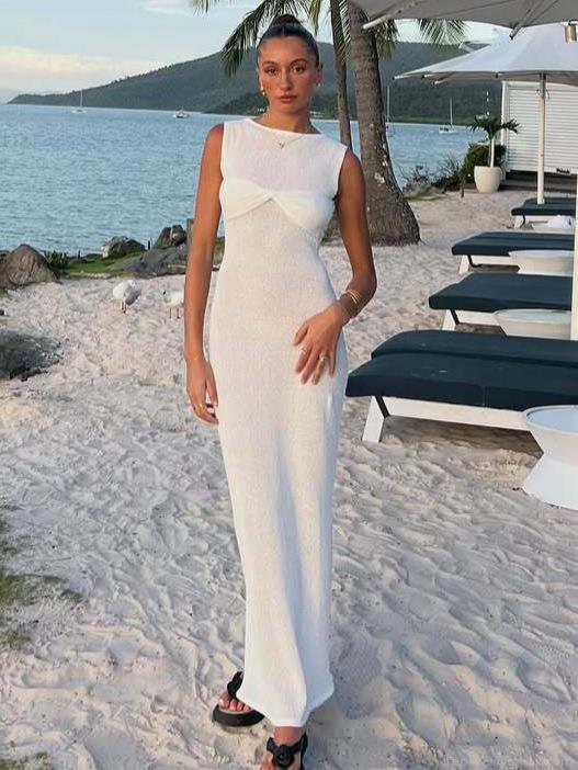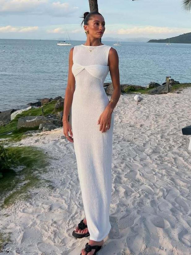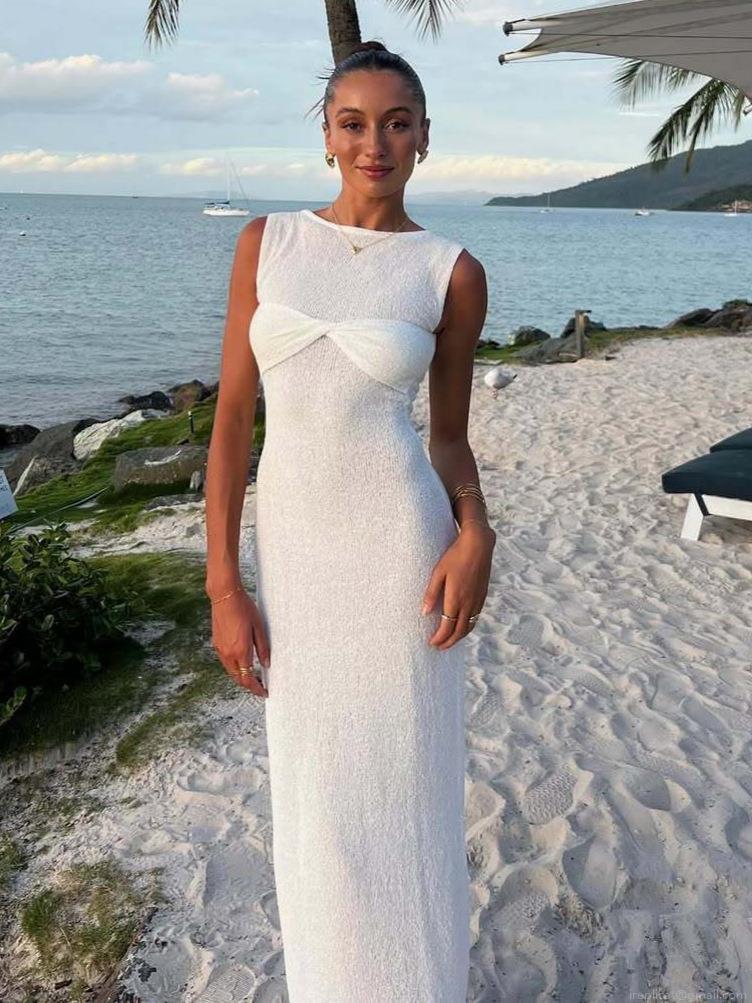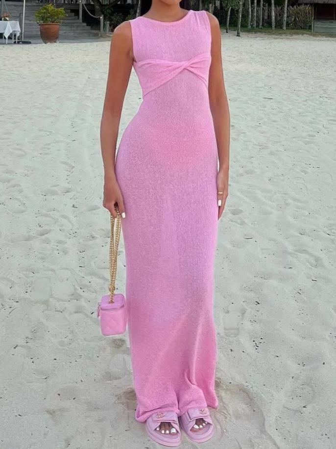 • Women's Sexy Twist Front Sleeveless Maxi Dress Elegant Knit Hollow Out Bodycon Long Sundress For Summer Beach Vacation Party Casual Pink White