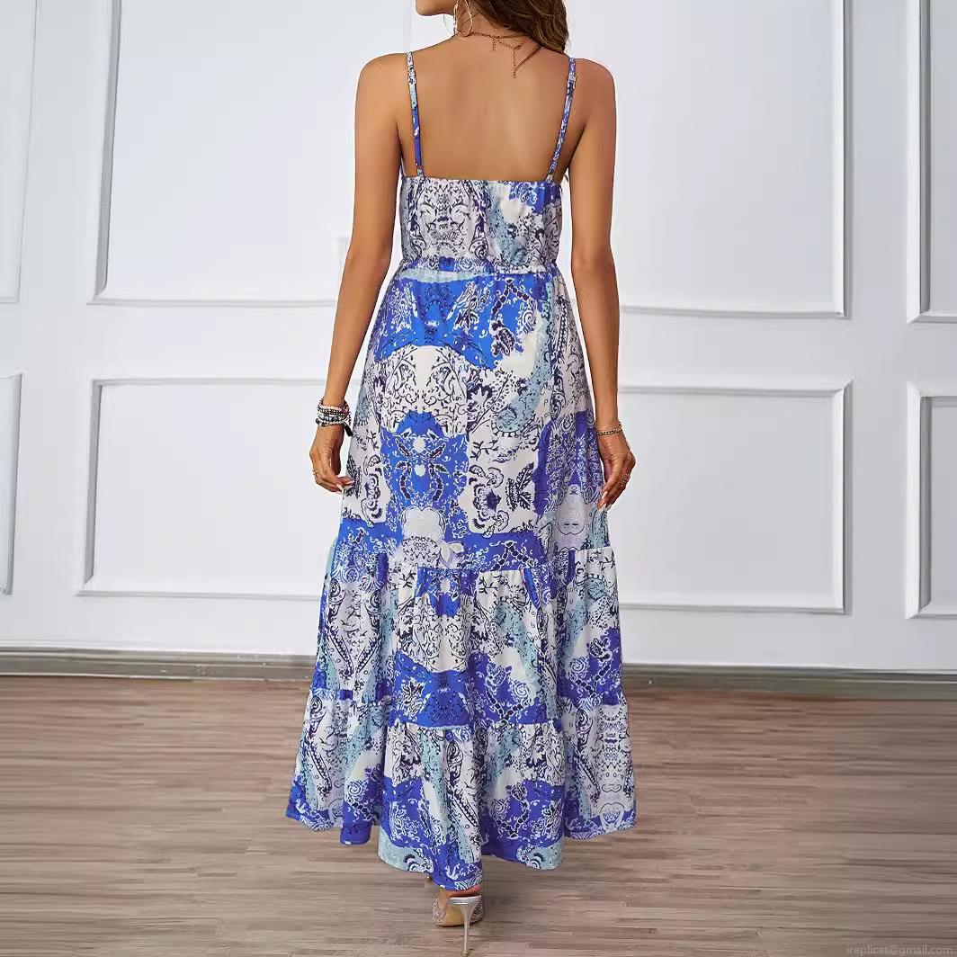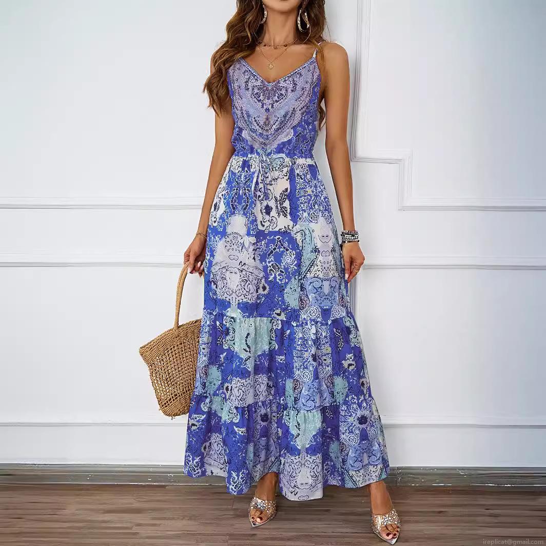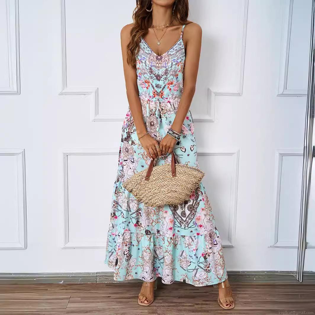 • Women's Sexy V Neck Bohemian Floral Print Maxi Dress Sleeveless Slip High Waist A-line Polyester Long Dress For Summer Vacation