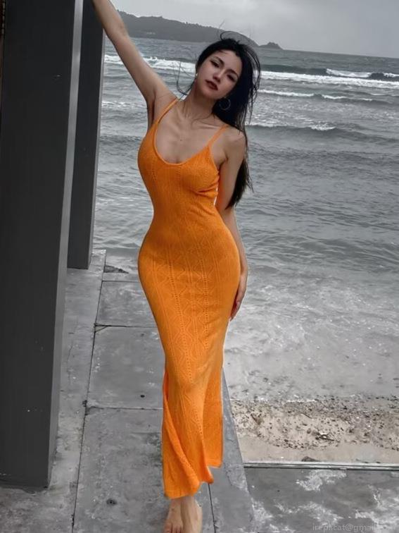 • Women's Sexy V Neck Crochet Knitted Maxi Dress Hollow Out Spaghetti Strap Bodycon Fish Tail Summer Beach Vacation Long Dress
