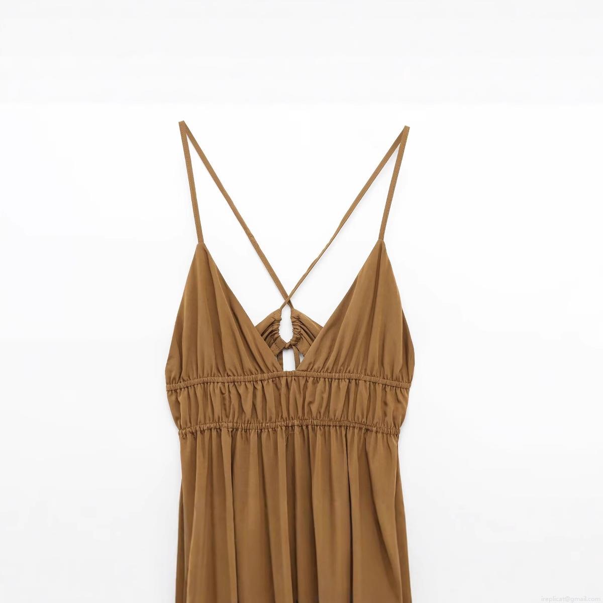 Solid Color, V-neck, Thin Straps, Gathered Design, Backless Cross