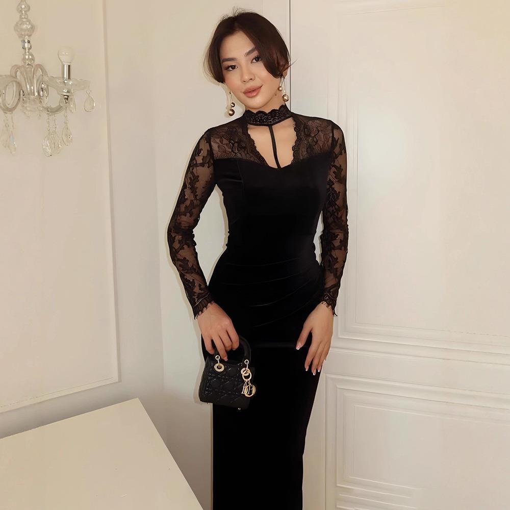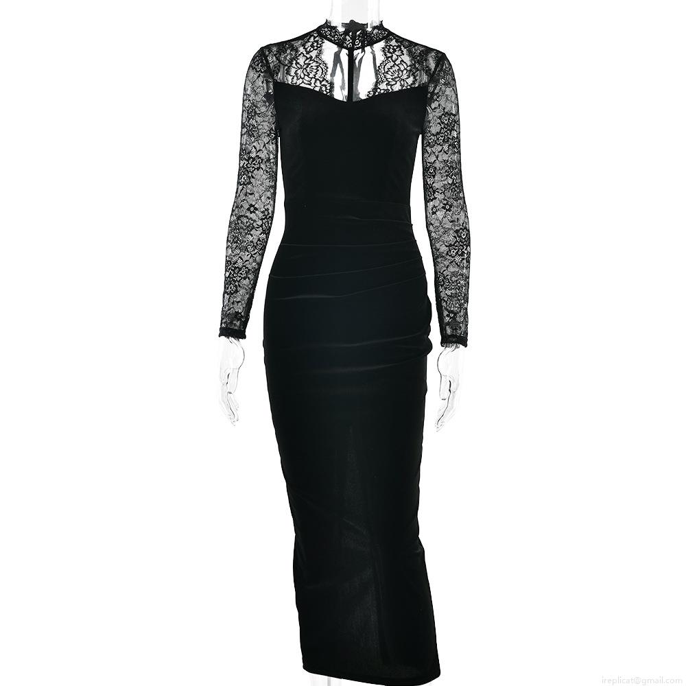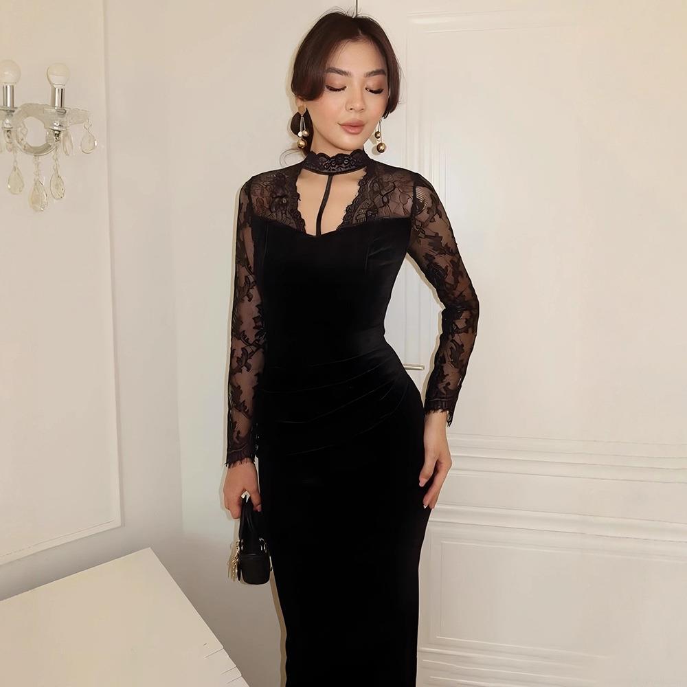 • Women's Sexy Velvet Lace Patchwork Maxi Dress Elegant Backless Long Sleeve V Neck Bodycon Evening Party Long Dresses for Women