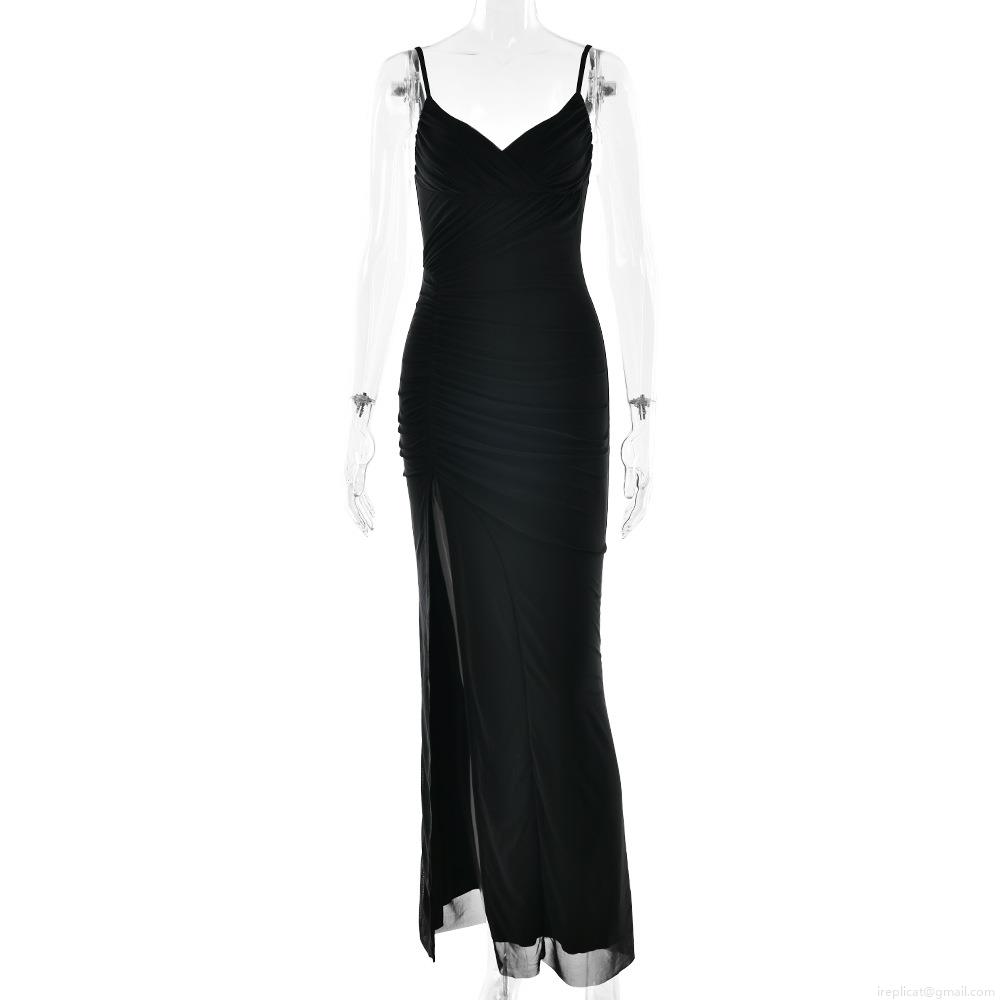 • Women's Sexy V-Neck Backless Ruched Bodycon Maxi Dress High Split Mesh Milk Silk Sleeveless Camisole Long Dress for Party Evening Clubwear