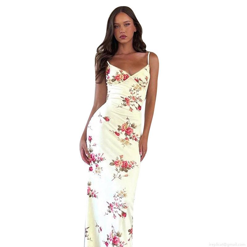 • Women's Sexy V-Neck Floral Print Cami Dress Backless High Waist Slim Fit Maxi Dress for Summer Vacation Party Hot Girl Style Clothing