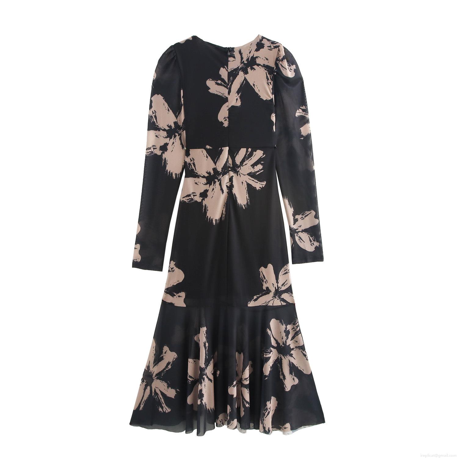 Women's Sexy V-Neck Mesh Polyester Maxi Dress Elegant Floral Print Ruched Long Sleeve Fishtail Bodycon Evening Party Club Gown