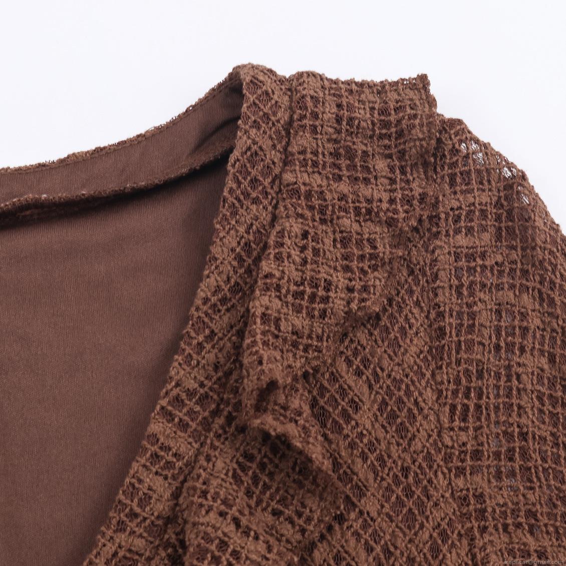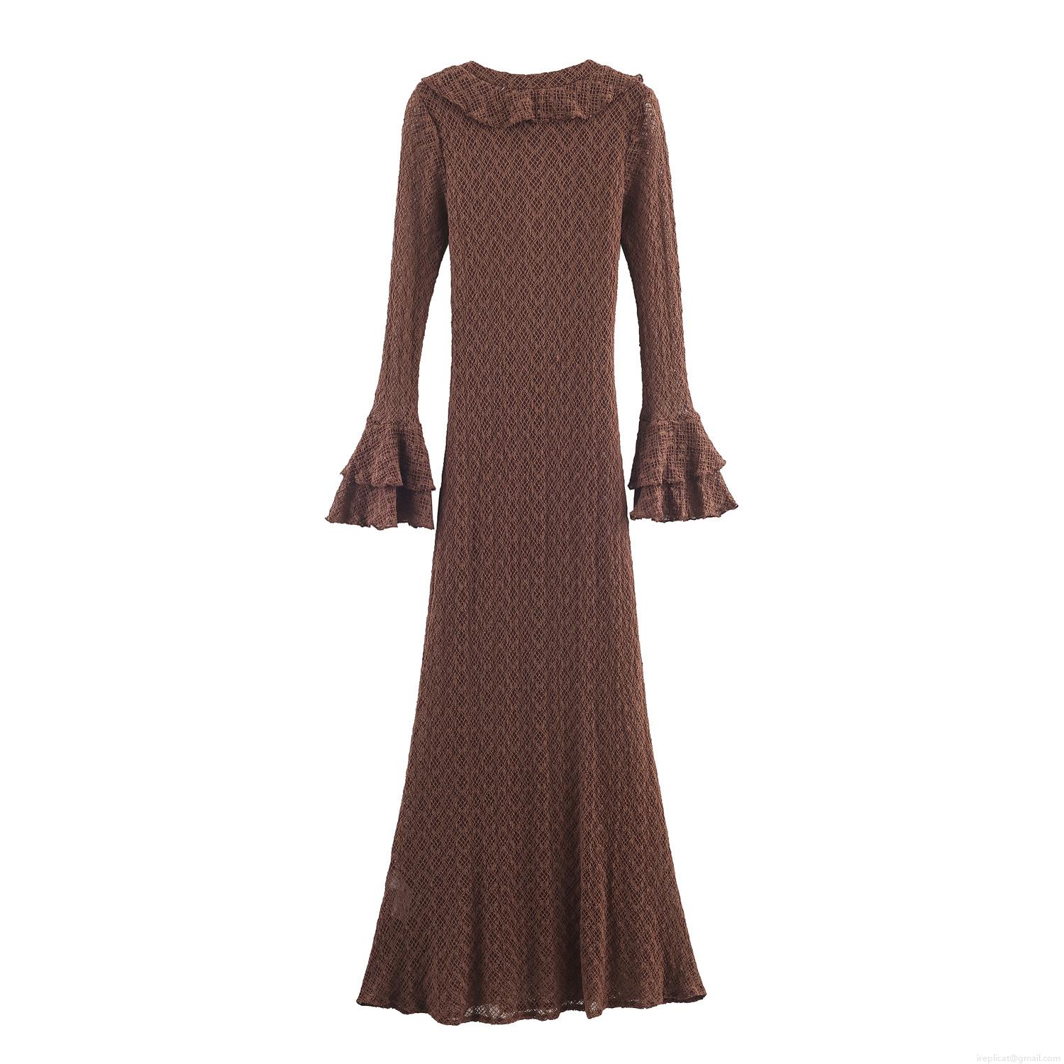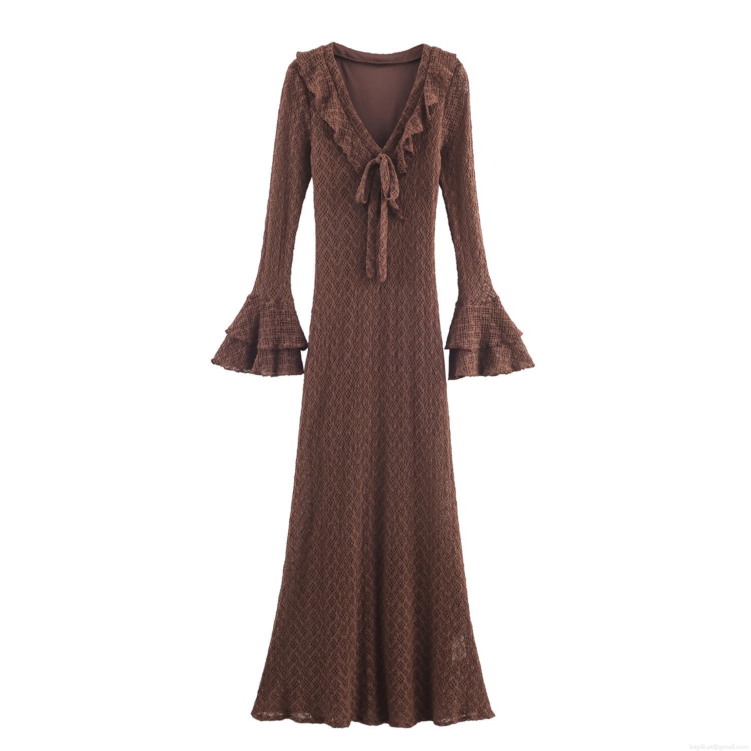 • Women's Sexy V-Neck Ruffle Knit Maxi Dress Hollow Out Mesh Flared Long Sleeve Tie Front Elegant Bodycon Evening Party Long Dress Coffee Brown Slim Fit Women Clothing