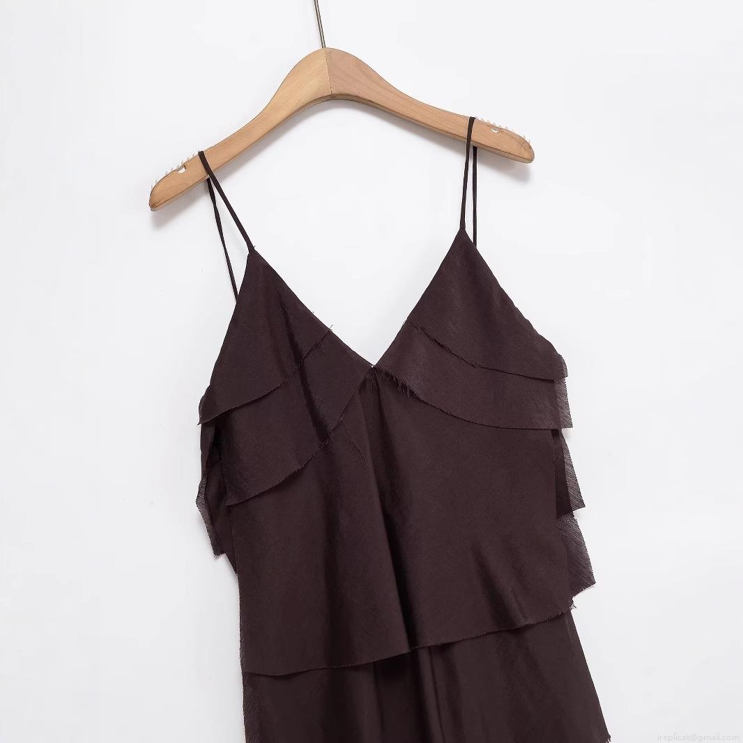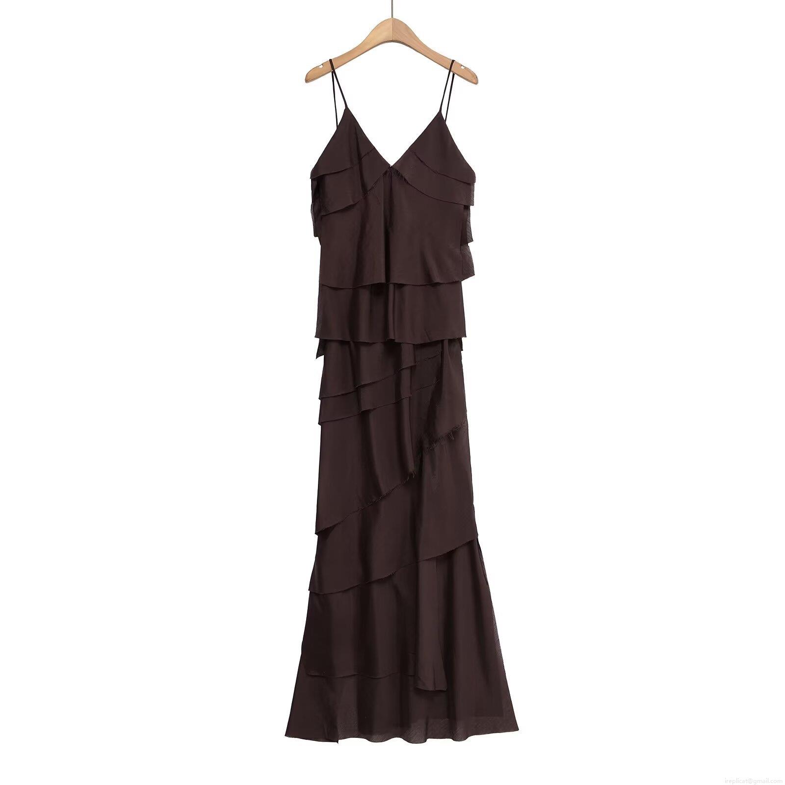 • Women's Sexy V-Neck Tiered Maxi Dress Elegant Spaghetti Strap Coffee Brown Polyester Ruffle Layered Long Dress For Evening Party Banquet Clubwear Vacation