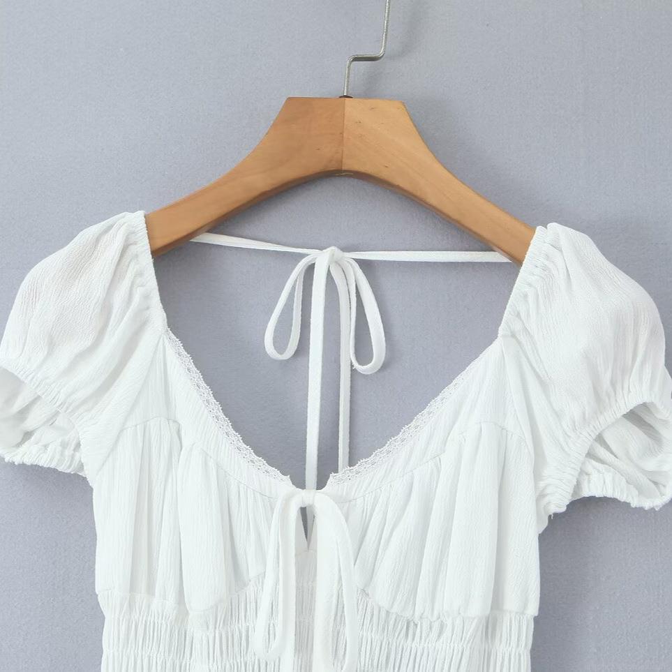 • Women's Sexy White Backless Smocked Maxi Dress Puff Sleeve Lace-up V-Neck Shirred Bust Long Dress For Wedding Party Vacation Beach Elegant Nylon Spandex Polyester Clothing