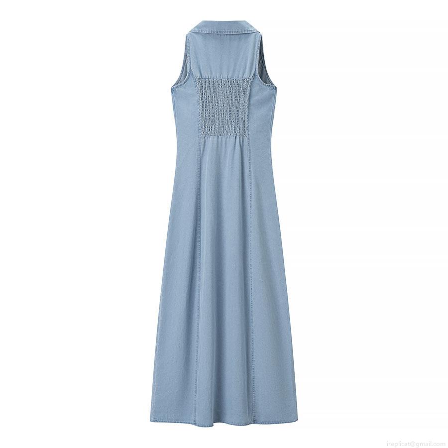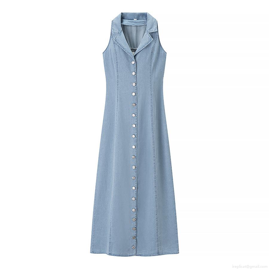 • Women's Sleeveless Denim Style Maxi Dress Single Breasted Lapel Collar Slim Fit Pencil Long Dress Casual Summer Streetwear Blue Vestidos