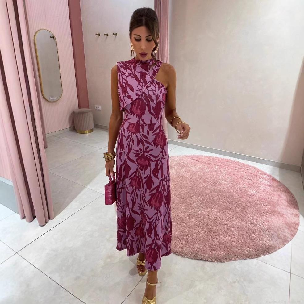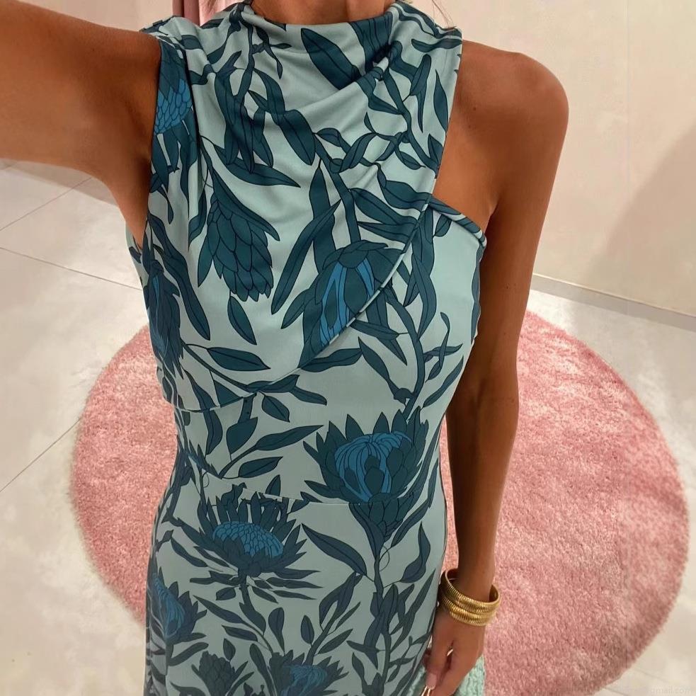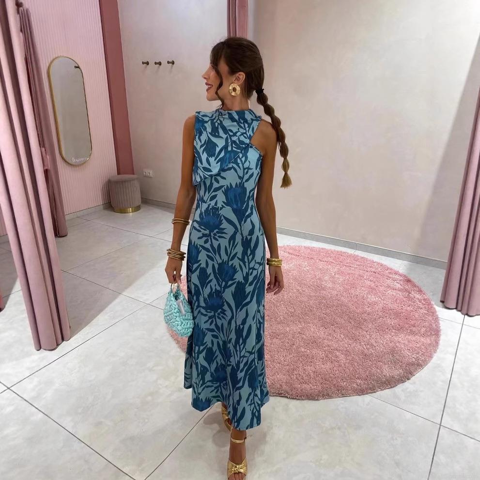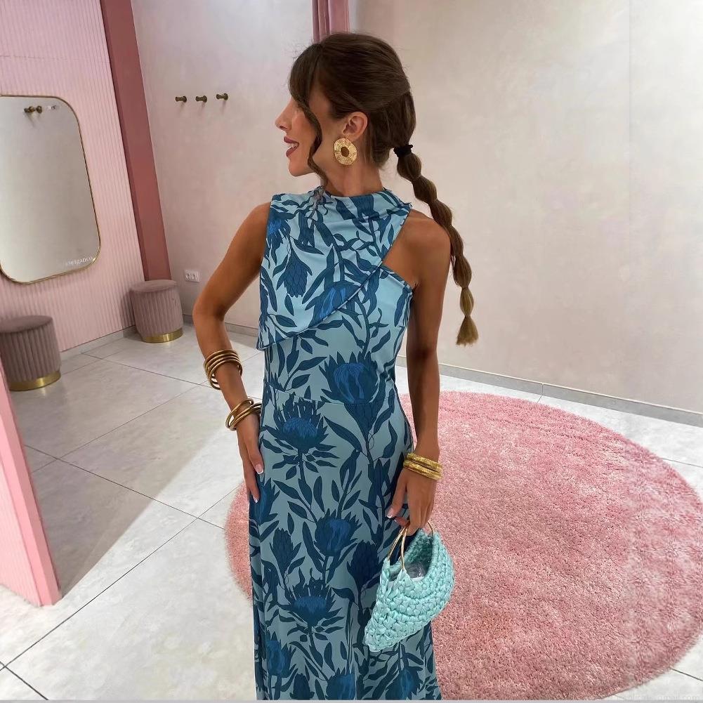 • Women's Sleeveless Halter Neck Floral Print Maxi Dress Elegant Polyester Slim Fit Long Sundress for Summer Party Vacation Daily Wear