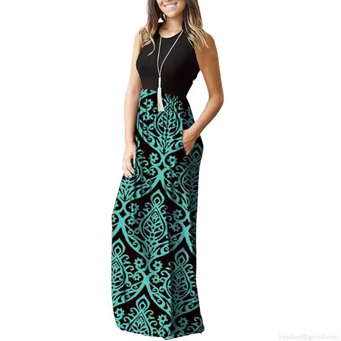 Women's Sleeveless Round Neck Patchwork Maxi Dress Elegant Chevron Wave Print High Waist Long Dress With Pockets Summer Casual Vacation Bohemian Polyester Dress