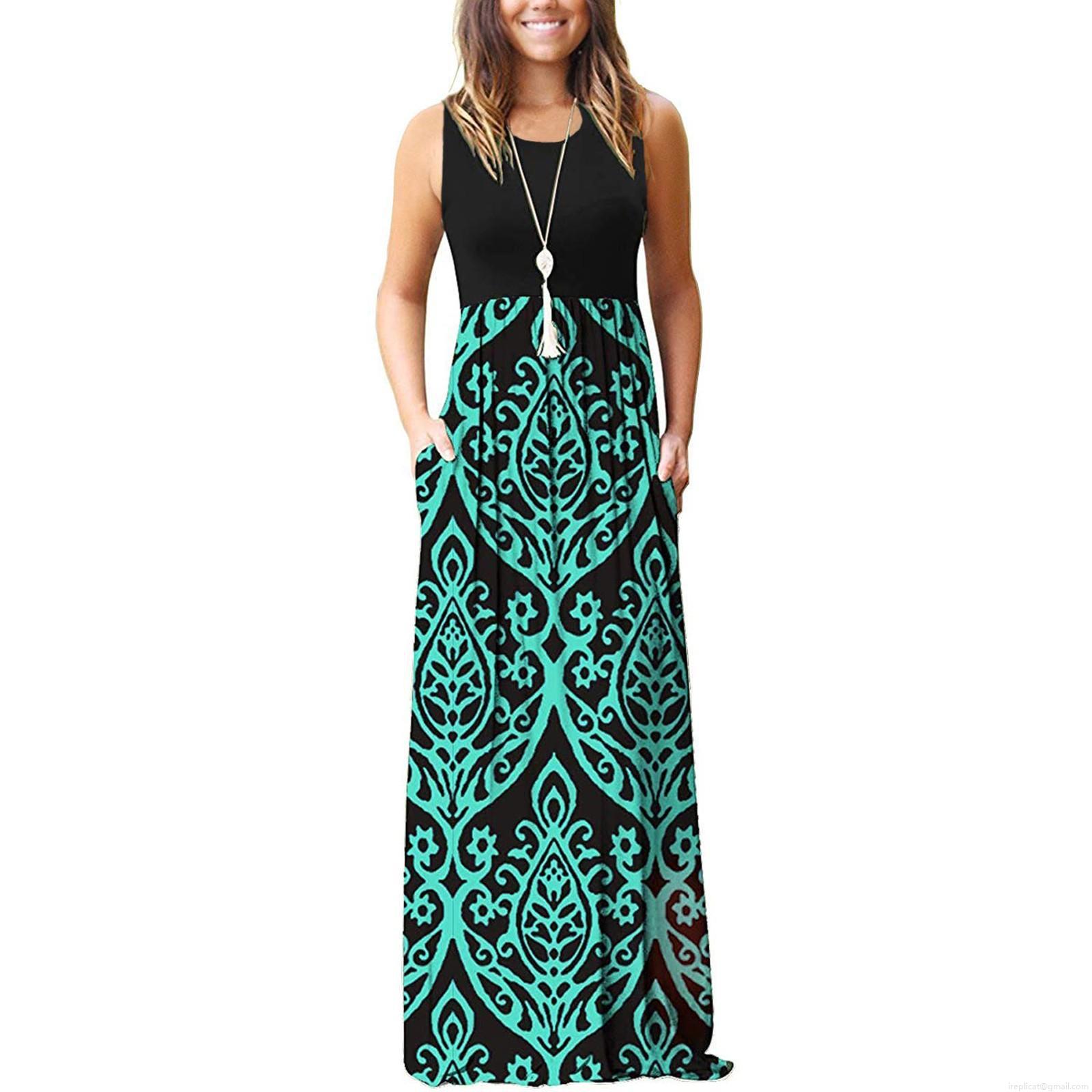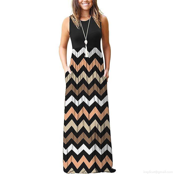 • Women's Sleeveless Round Neck Patchwork Maxi Dress Elegant Chevron Wave Print High Waist Long Dress With Pockets Summer Casual Vacation Bohemian Polyester Dress