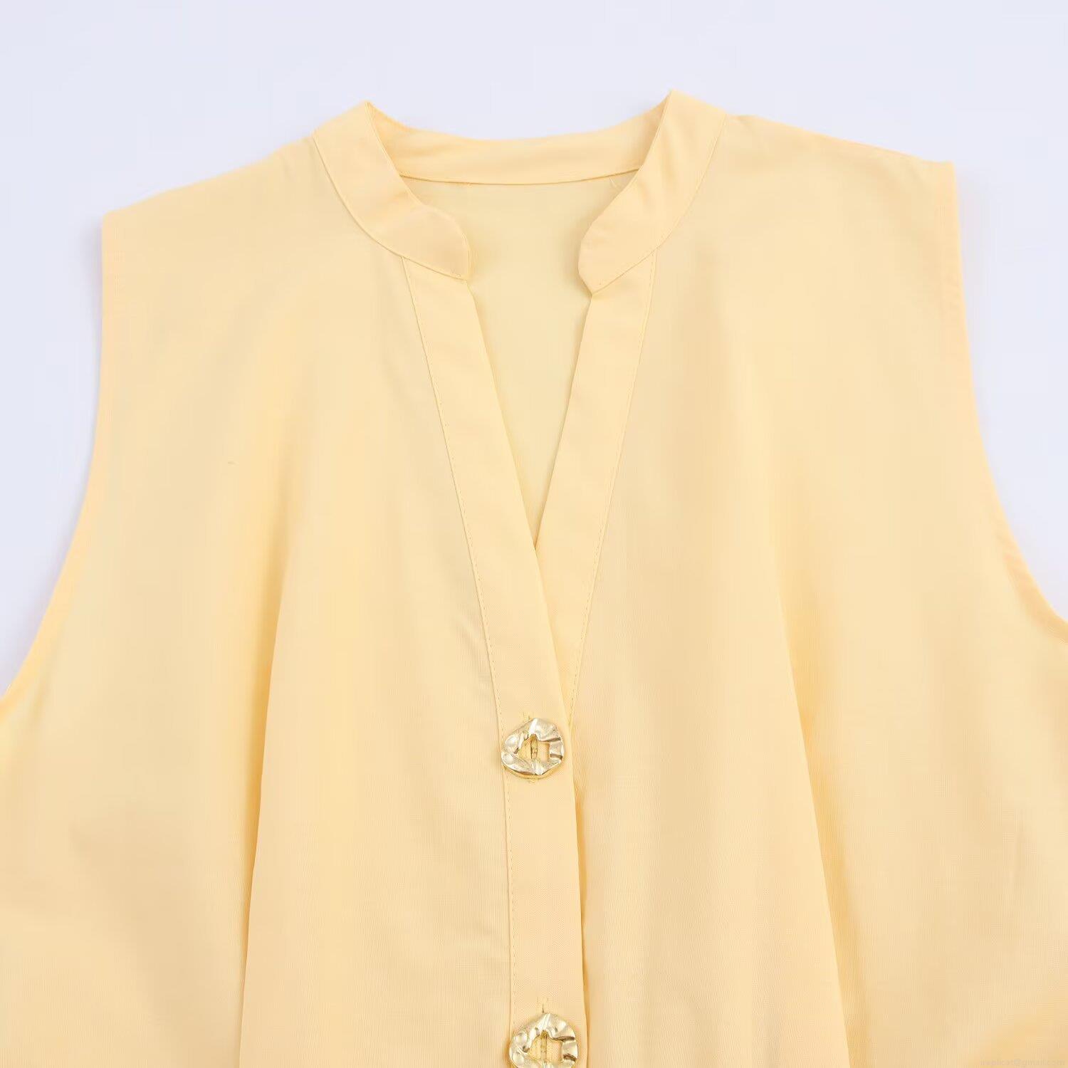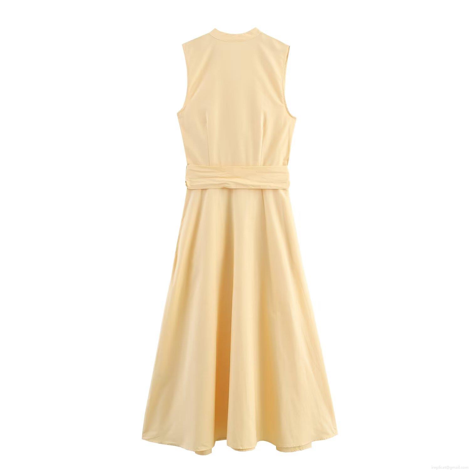 • Women's Sleeveless V-Neck Maxi Dress Elegant Pleated Poplin Long Dress With Belt Pale Yellow Slim Fit Single Breasted Party Gown For Lady Summer Vacation
