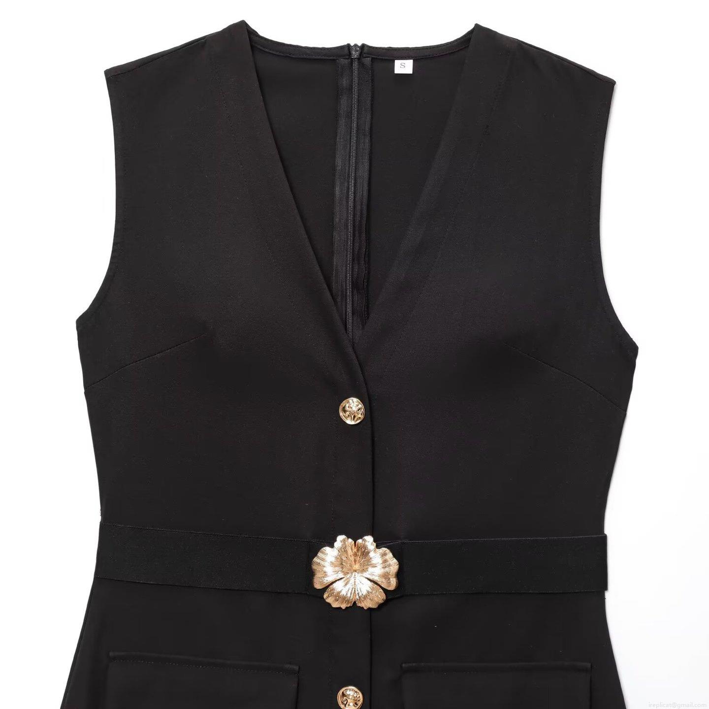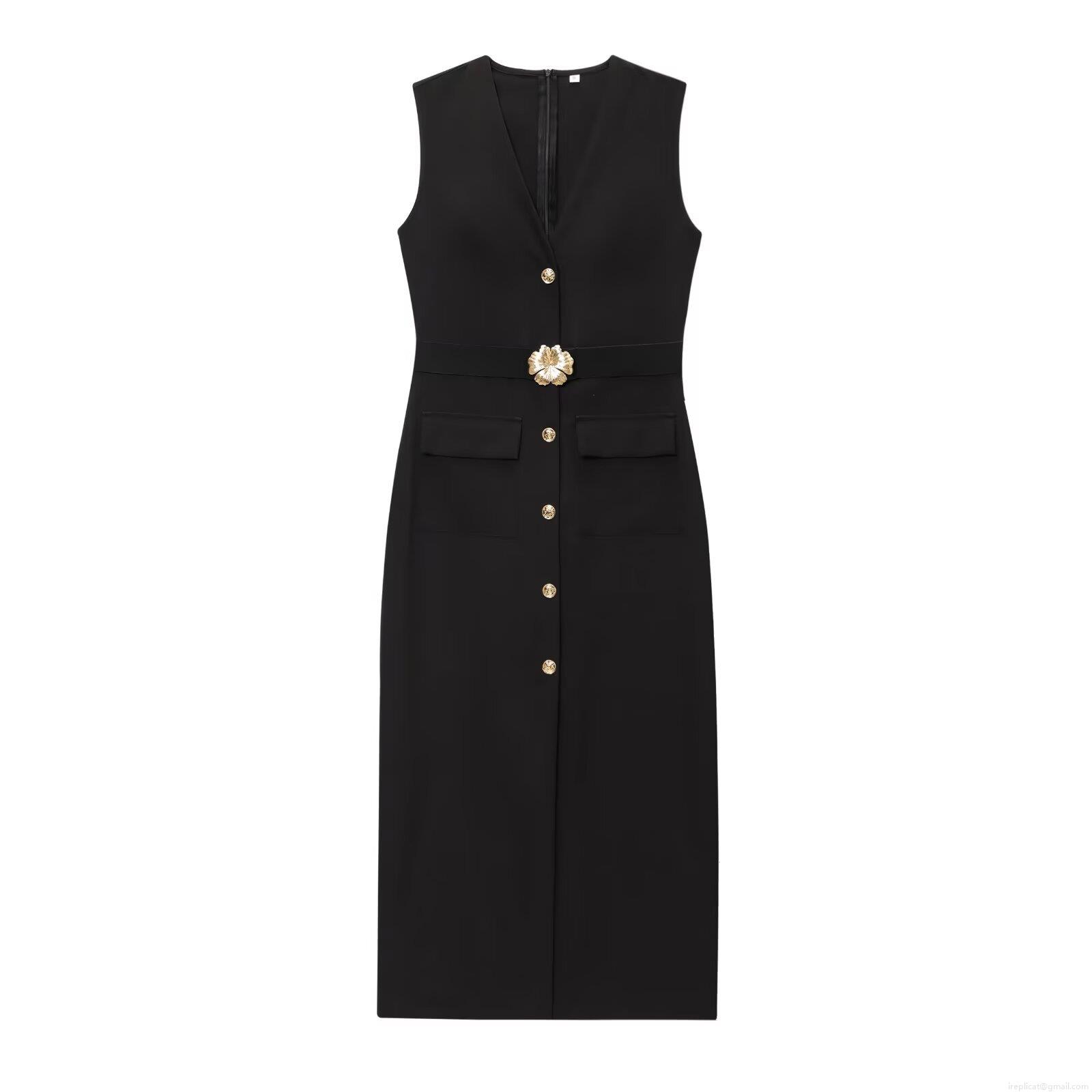 Women's Sleeveless V-Neck Maxi Dress With Gold Flower Buckle Belt And Lion Head Buttons Elegant Black Crepe Slim Fit Long Party Cocktail Dresses