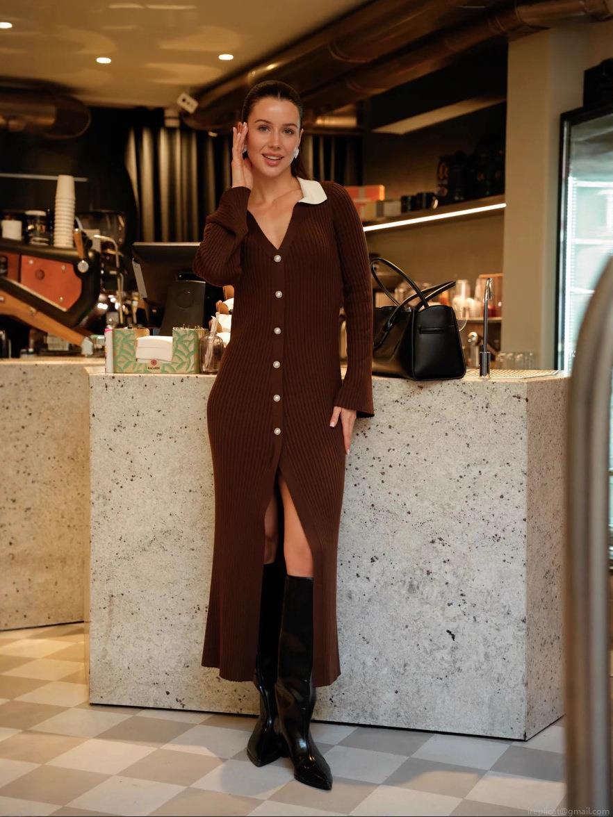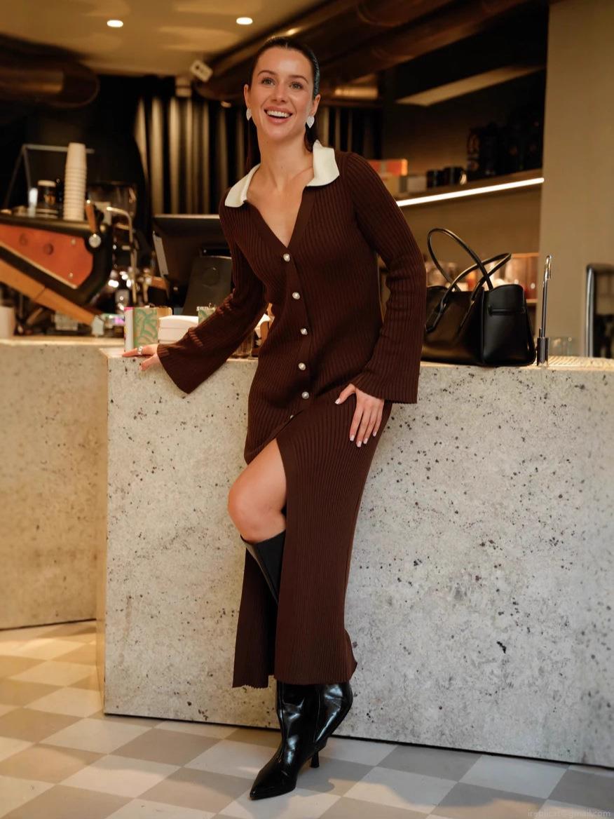 • Women's Slim Fit Knit Maxi Dress White Contrast Polo Collar Pearl Single Breasted Ribbed Long Sleeve Bodycon Dress With Side Slit